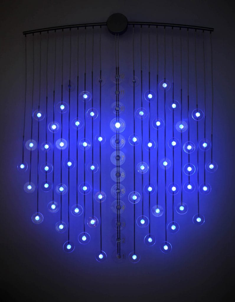 Ici, le temps, fait de lumière bleue, s’échappe vers les hauteurs de l’objet tel une fumée, dernière trace de ce qui fut. Par son aspect dynamique cette oeuvre capte l’attention du spectateur pour l’amener à la conscience de l’instant présent.