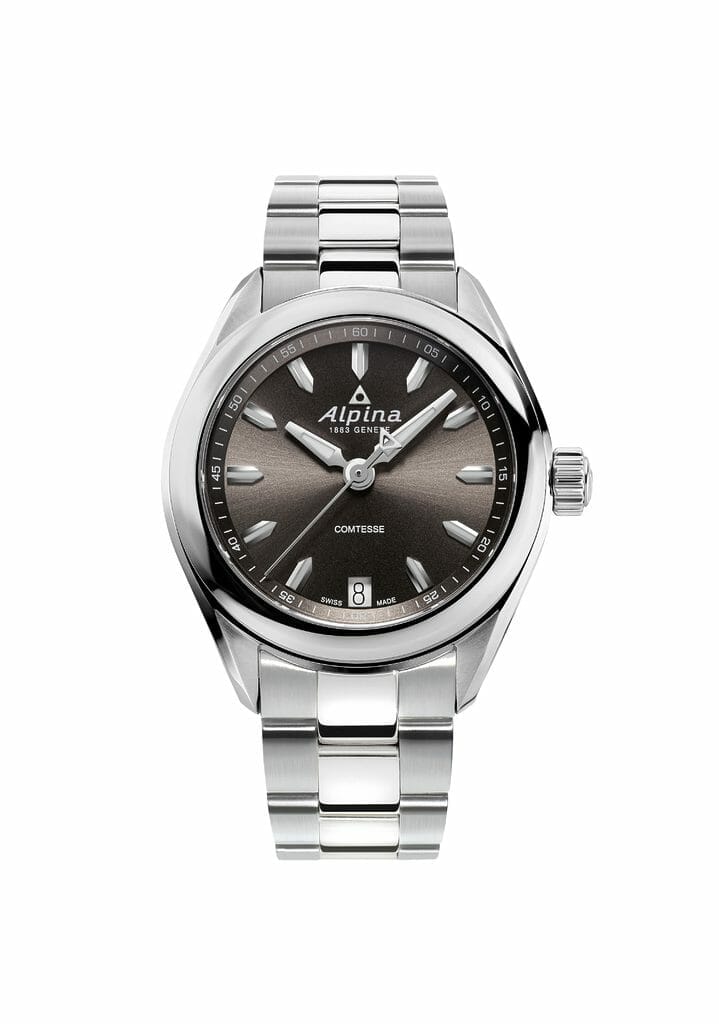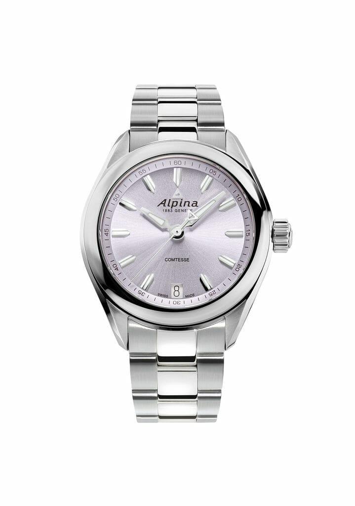 Côté cadran, chaque modèle partage un guichet de date à 6h et trois aiguilles centrales. Celles des heures et minutes sont luminescentes, à l’instar des index appliqués, afin d’offrir une parfaite lisibilité du crépuscule à l’aube. Les amatrices d’Alpina pourront toujours noter le contrepoids de l’aiguille des secondes en forme de triangle, discret rappel des sommets alpins qui ont donné leur nom à la Maison. Enfin, une subtile minuterie en chiffres arabes, à fleur de rehaut, rappelle l’ascendance sportive de l’Alpiner Comtesse Quartz.