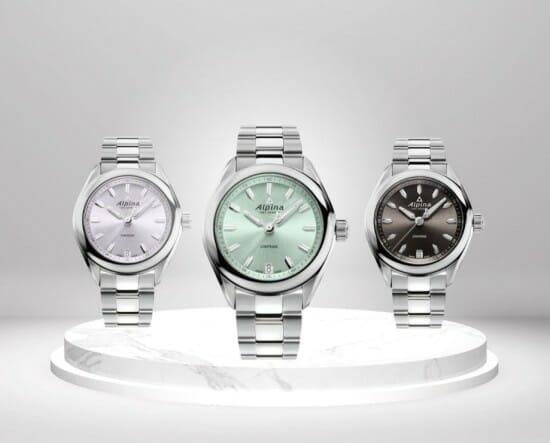 Côté cadran, chaque modèle partage un guichet de date à 6h et trois aiguilles centrales. Celles des heures et minutes sont luminescentes, à l’instar des index appliqués, afin d’offrir une parfaite lisibilité du crépuscule à l’aube. Les amatrices d’Alpina pourront toujours noter le contrepoids de l’aiguille des secondes en forme de triangle, discret rappel des sommets alpins qui ont donné leur nom à la Maison. Enfin, une subtile minuterie en chiffres arabes, à fleur de rehaut, rappelle l’ascendance sportive de l’Alpiner Comtesse Quartz.