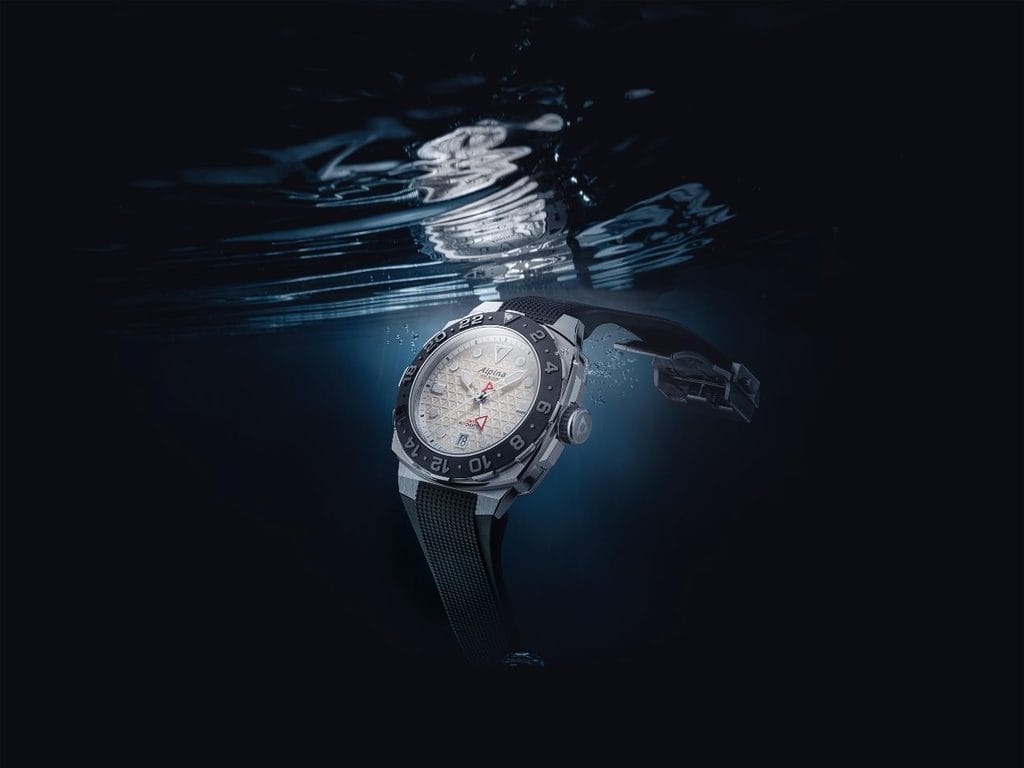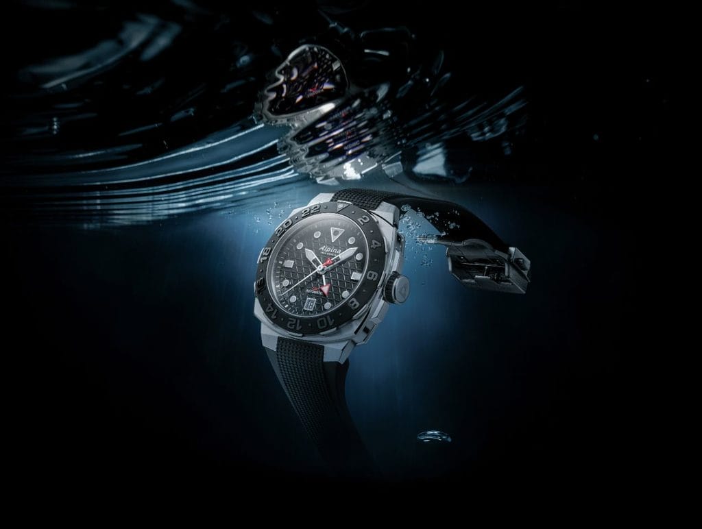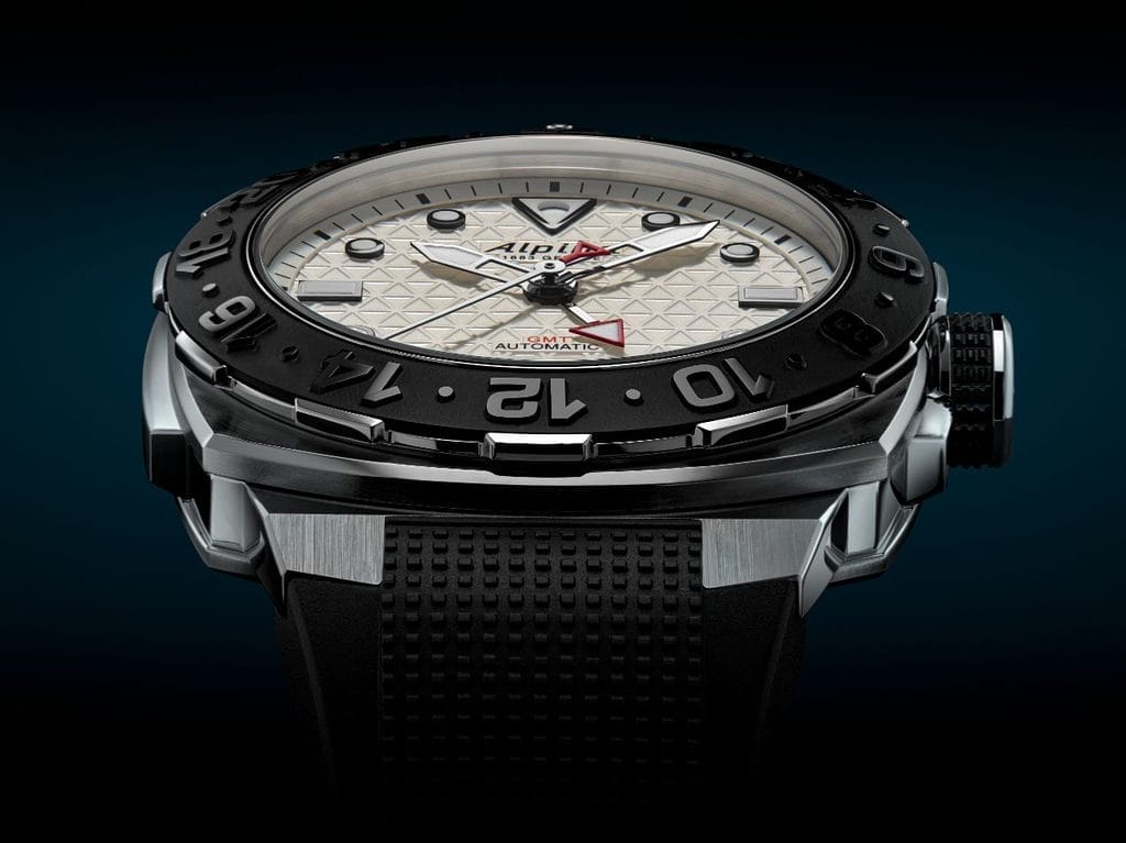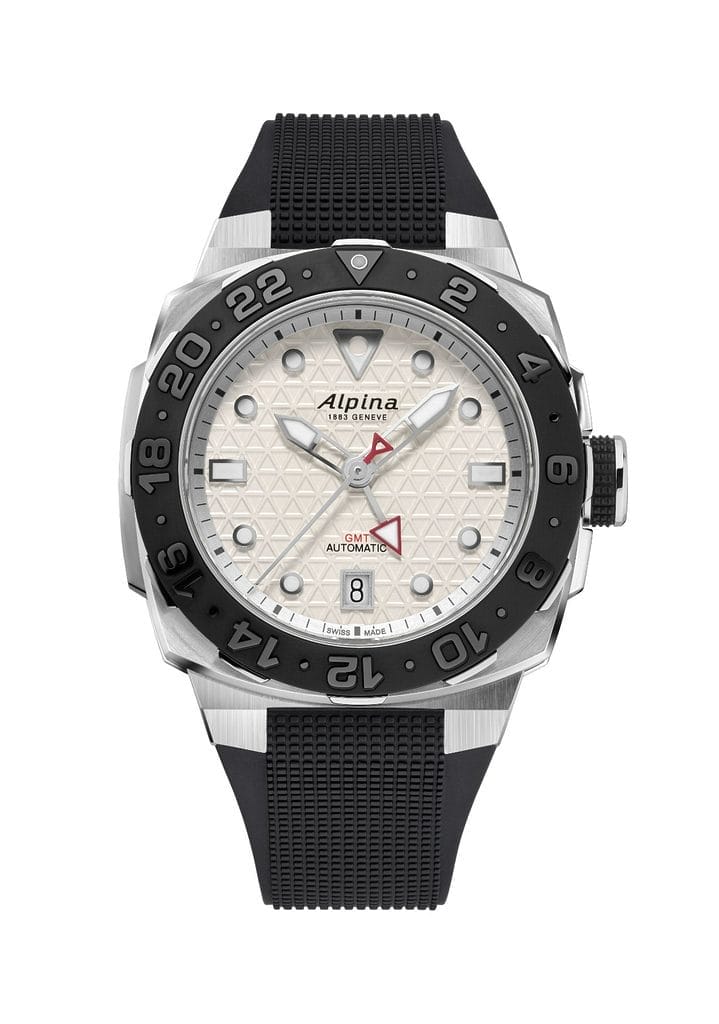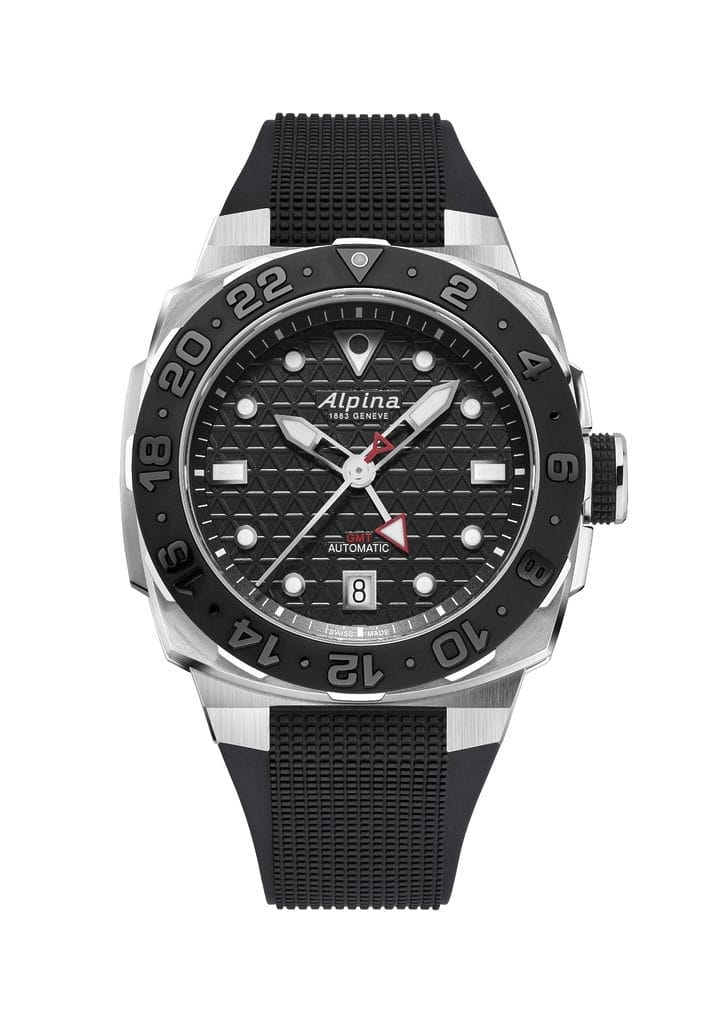 Et pour les baroudeurs nécessitant un troisième fuseau, il sera toujours possible de l’indiquer grâce à la lunette. Gravée sur 24h, elle offre en sus la distinction entre les heures de jour et de nuit. Il suffit d’utiliser la lunette pour faire pointer l’heure du 3ème fuseau directement en face de l’aiguille du GMT. La Seastrong Diver Extreme Automatic GMT est la première montre d’Alpina dotée d’une lunette indiquant un troisième fuseau horaire.