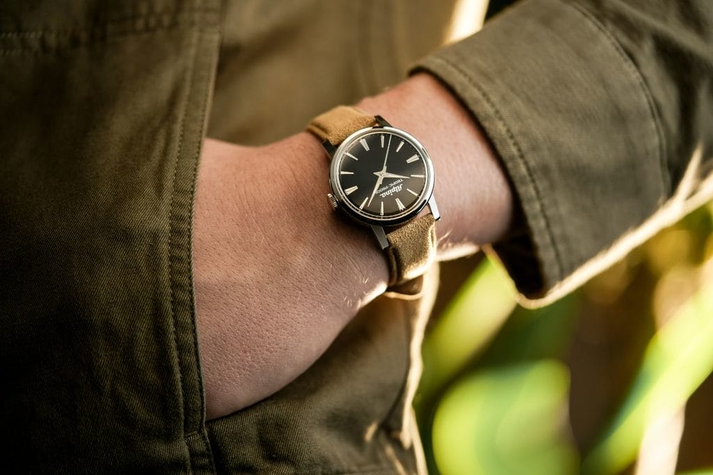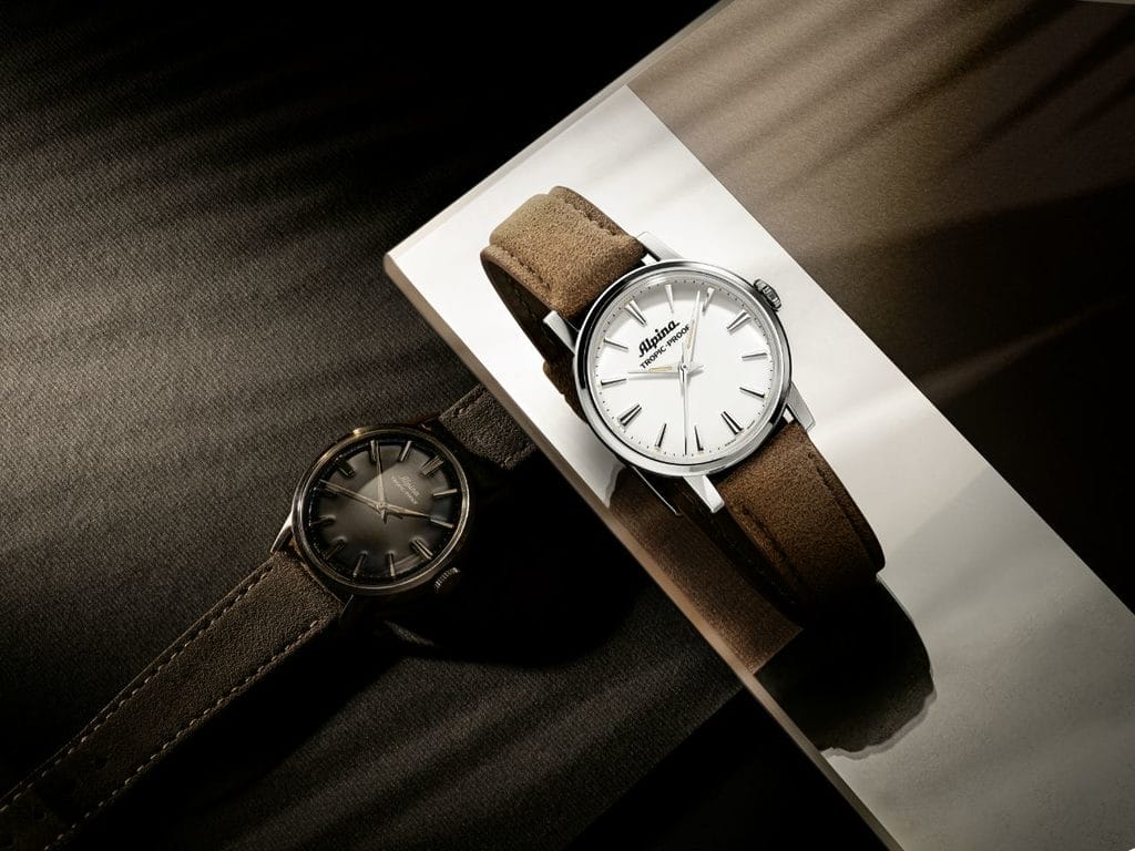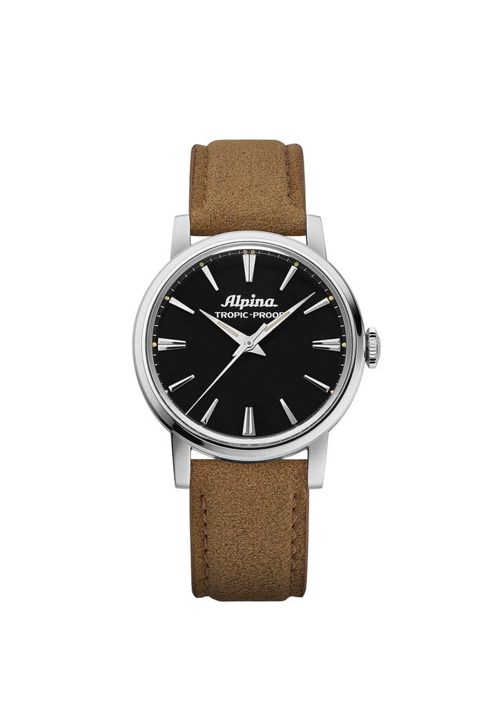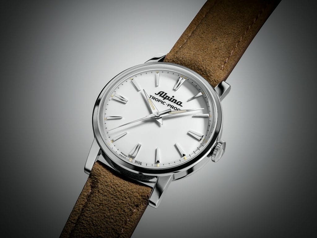 Avec 142 ans d’histoire, Alpina possède un patrimoine encore largement méconnu. En son cœur, la Tropic-Proof incarne l’esprit aventurier de la marque. Conçue au milieu des années 60, elle se distingue par un boîtier ultra-robuste signé F. Borgel, un mouvement Swiss Made déjà doté de deux jours de réserve de marche et un design pensé pour une lisibilité optimale. Ce modèle pionnier a jeté les bases de l’Alpina moderne. Aujourd’hui, la maison lui rend un hommage fidèle à travers deux rééditions disponibles avec cadran blanc ou noir, conservant un diamètre de 34 mm, des aiguilles dauphine, un boîtier acier et un mouvement manuel, le tout monté sur bracelet en Alcantara.