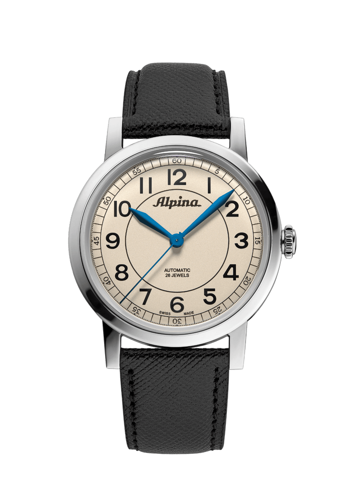 Côté cadran, less is more. L’Heritage Automatic observe tous les codes esthétiques de la Belle Époque : deux aiguilles dauphines bleuies, une minuterie « chemin de fer ». Rien de plus. Juste l’essentiel, dans un remarquable équilibre où même le logo Alpina a été restitué dans sa typographie des années 20. Deux variations sont disponibles : cadran intégralement beige avec 12 chiffres arabes, ou centre beige avec tour d’heures gris satiné paré de chiffres arabes aux heures cardinales alternés avec des index bâtons de couleur bronze.