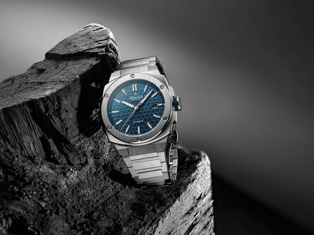 Côté cadran, Alpina a préservé la signature emblématique de la ligne Alpiner Extreme. Sa surface est frappée d’un motif triangulaire inspiré du logo de la maison, repris sur le contrepoids de l’aiguille des secondes pour la version Automatic – rappel des sommets enneigés chers à Alpina.