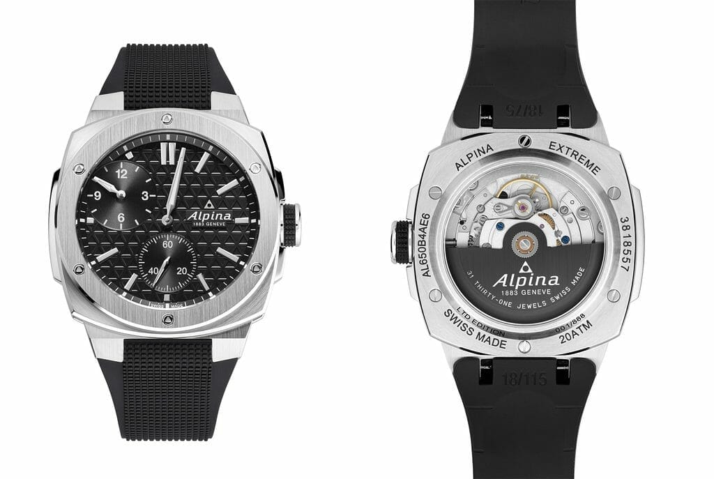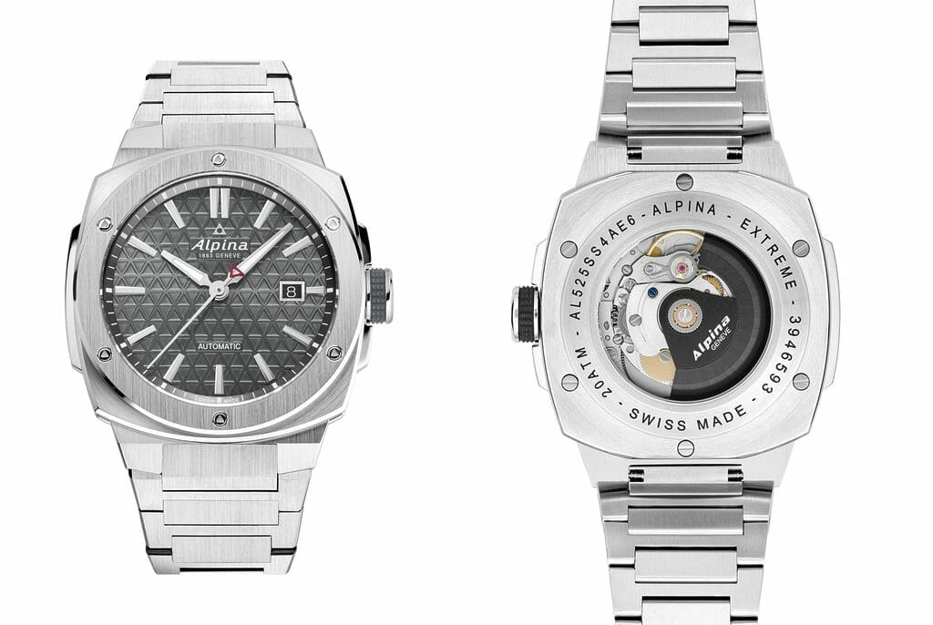 Si ces garde-temps ont tous quelque chose de différent, ils ont aussi un large patrimoine commun. Le plus évident : ce robuste boîtier en acier, véritable signature esthétique de la ligne Alpiner Extreme. Refusant de choisir entre rond et carré, sa géométrie impose un format coussin atypique et puissant de 41 mm par 42,5 mm de côté. Alpina a opté pour une alternance de finitions polies et mattes (brossées) – fidèle à l’esthétique Swiss Made traditionnelle.