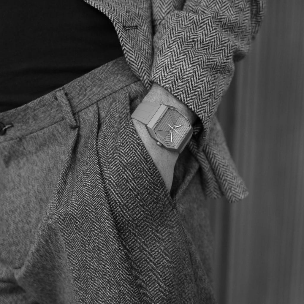 La ART 01 MONOCHROME GREY, quant à elle, rend hommage au brutalisme horloger. Son boîtier en titane microbillé révèle une texture brute et subtile, où chaque finition est pensée pour capter la lumière différemment. Cadran, bracelet, cornes… chaque élément est une variation de cette teinte titane, une quête de l’équilibre parfait entre nuances et matières. Un travail d’orfèvre a été nécessaire pour que toutes ces surfaces, pourtant si différentes, puissent s’unir en une seule et même identité.