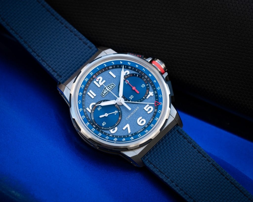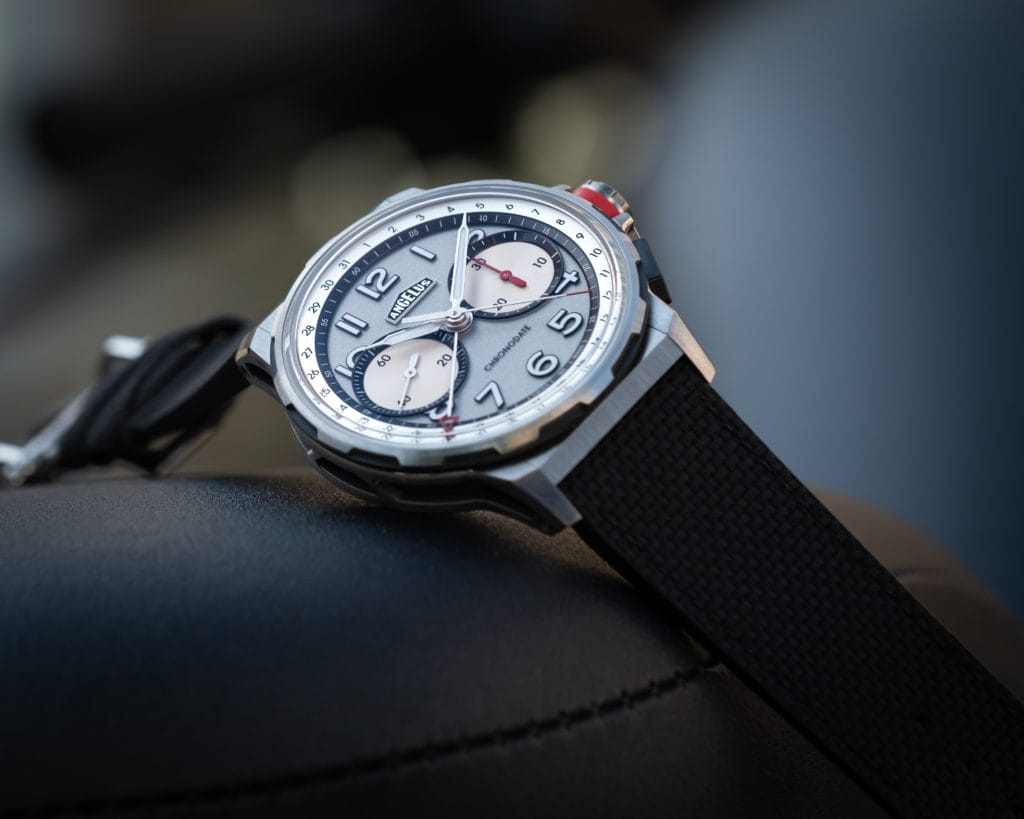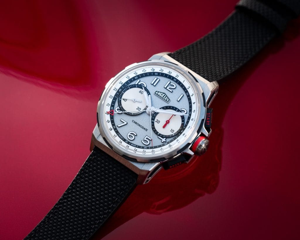 A l’intérieur, Angelus a installé son nouveau calibre A-500. Son format bi-compax affiche la petite seconde à 9 heures et un compteur de chronographe de 30 minutes à 3 heures. En périphérie, un dateur à aiguille fait le tour du cadran. Sa tête flèche rouge ajourée annonce le thème chromatique des indications secondaires de Chronodate : les marquages sur les poussoirs de chronographe, la trotteuse de chronographe et l’aiguille de son compteur 30 minutes sont toutes terminées par une touche de laque rouge.