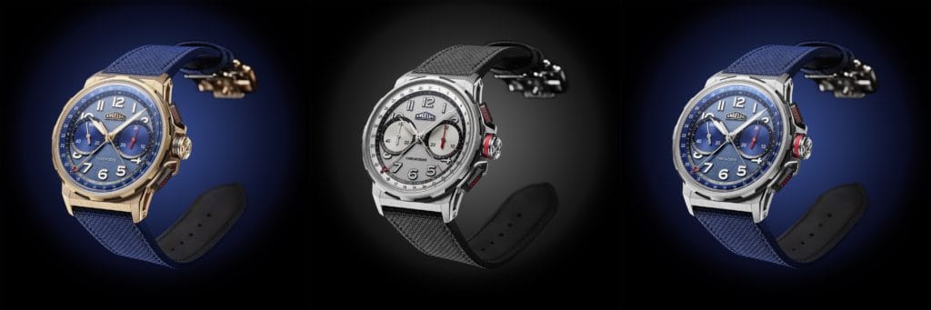Les compteurs comme les chiffres arabes en applique sont posés sur des cadrans mats, comme du verre dépoli. Une première en horlogerie, accentuant encore l’effet de profondeur de l’ensemble et se mariant avec élégance au boîtier sportif. Chronodate or rouge est présenté avec un cadran PVD bleu tandis que les versions titane sont déclinées en blanc opalin ou PVD bleu.