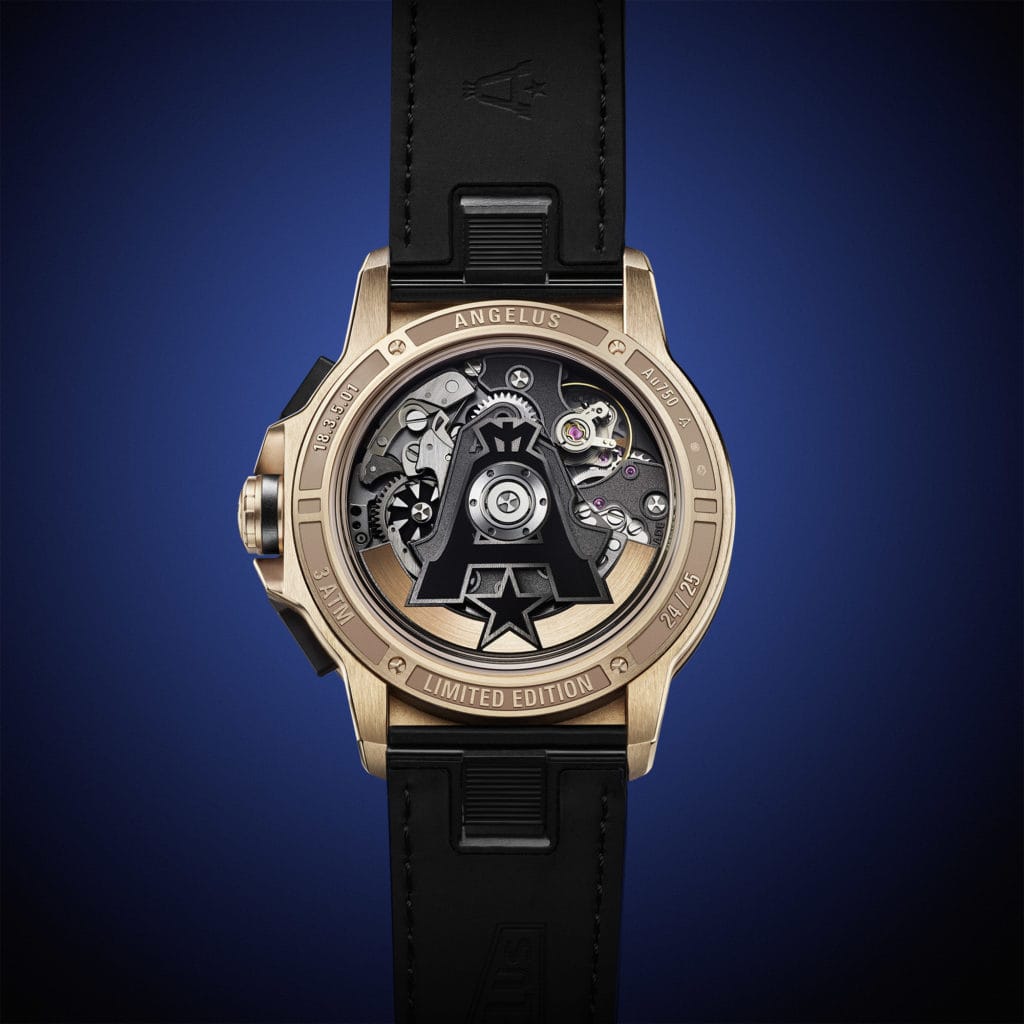 Cadencé à 4 Hz, le chronographe opère grâce à une roue à colonnes et un embrayage horizontal pour éviter de gagner en épaisseur. Son remontage automatique est assuré par une masse oscillante au design historique, évocation des premiers succès d’Angelus.