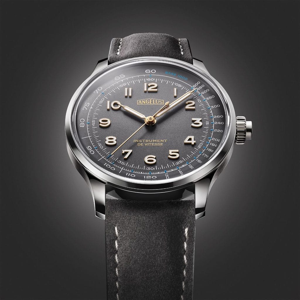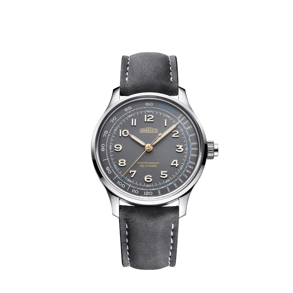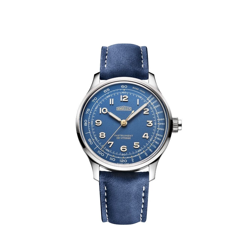 Instrument de Vitesse, le dernier modèle de chronographe de la marque Angelus, est une montre qui privilégie une esthétique épurée, inspirée par les montres vintage de la première moitié du XXe siècle. Sans compteurs auxiliaires et avec une échelle tachymétrique délicatement imprimée en périphérie du cadran, elle affiche une pureté visuelle qui met l’accent sur la lisibilité et la fonctionnalité. Proposée dans deux teintes élégantes, bleu Indianapolis et gris Silverstone, cette collection rend hommage aux racines sportives de l’horlogerie en intégrant des éléments subtilement modernes.