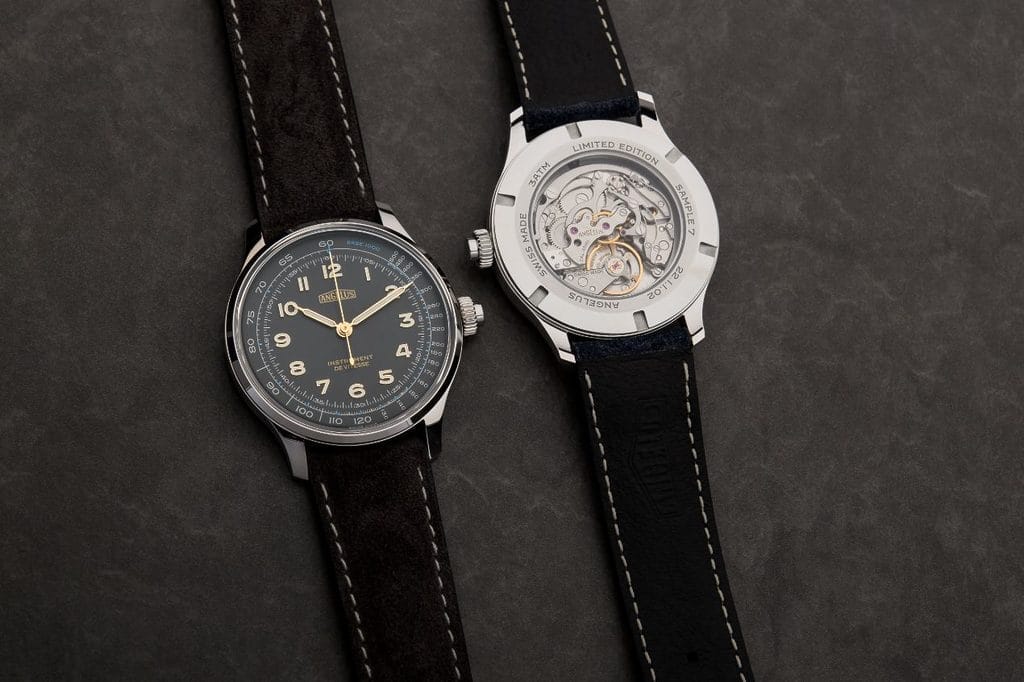 À l’intérieur d’Instrument de Vitesse, on retrouve le calibre A5000, un mouvement de chronographe fabriqué par La Joux-Perret, société sœur d’Angelus. Ce calibre est un mouvement manuel sans totaliseurs, une configuration rare qui accentue la finesse et la simplicité du chronographe. D’une épaisseur de 4,20 mm, il est calé sur une fréquence de 3 Hz (21 600 alternances par heure) et équipé d’une roue à colonnes et d’un embrayage horizontal — des caractéristiques typiques des chronographes des années 1950, renforçant le caractère nostalgique et authentique de ce modèle.