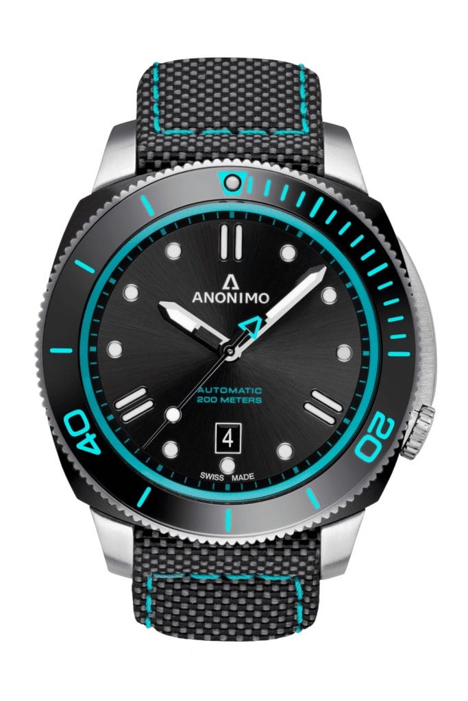 Avec l’arrivée de la nouvelle ligne EPURATO et du modèle MILITARE WRC en 2018, la NAUTILO, troisième pilier d’ANONIMO, était restée plus discrète. Il est temps maintenant de la mettre en lumière et elle se dévoile, toute aussi pétillante que la boisson énergisante éponyme, 100% naturelle. Cette nouvelle NAUTILO automatique affiche plus volontairement ce “turquoise Léopard” sur la lunette unidirectionnelle, le bracelet et même le contrepoids de la trotteuse. Le rehaut également coloré vient dynamiser la sobriété du modèle où le noir domine. Quant au chemin de fer, sa lisibilité sur le cadran est accentuée grâce au contraste des couleurs. En écho au point positionné à midi et aux chiffres 20 et 40 gravés dans la lunette, les appliques à midi, 4h00 et 8h00 disposent de doubles bâtons et évoquent ainsi la traditionnelle lecture en triangle de la marque tout en assurant une visibilité optimale avec le Swiss Super-LumiNova.