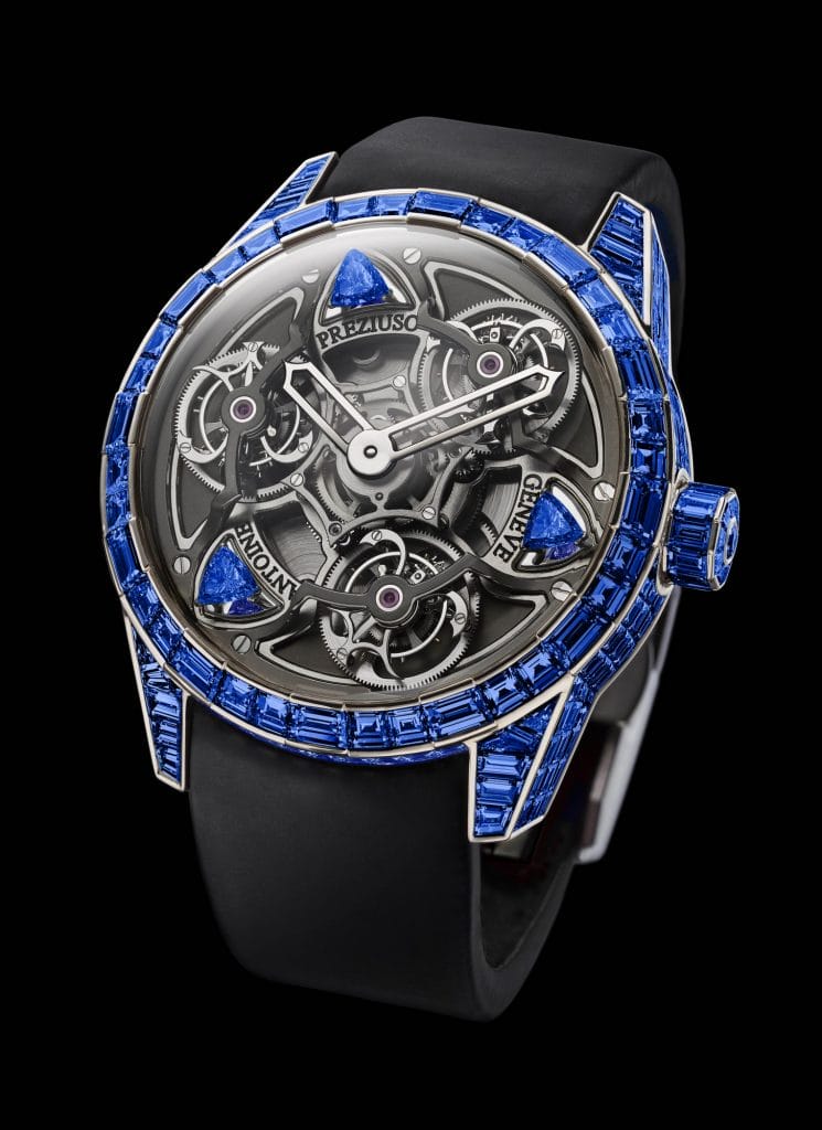 Cette montre unique en or blanc 18 ct. est composée de 233 saphirs de plus 24 carats au total, d’un bleu, royal, en taille baguette, serti invisible, dont trois saphirs trillion solitaires volants sur le cadran, aux côtés des trois tourbillons présents. En effet, c’est le mouvement Tourbillon of Tourbillons, icône de la Marque, fruit d’un travail à quatre mains avec son fils Florian, qui est au cœur de cette merveille lumineuse.