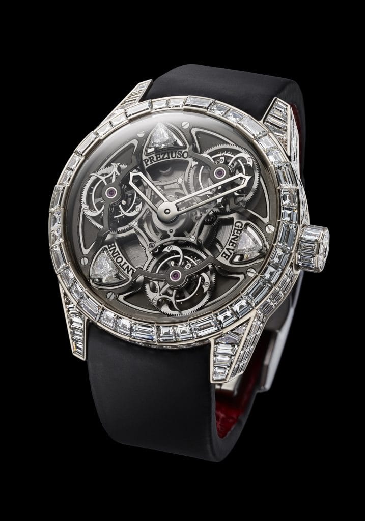 Le Trillion Tourbillon of Tourbillons offre une fascinante symphonie de lumières et démontre la capacité d´Antoine Preziuso à conjuguer Haute Horlogerie avec Haute Joaillerie.