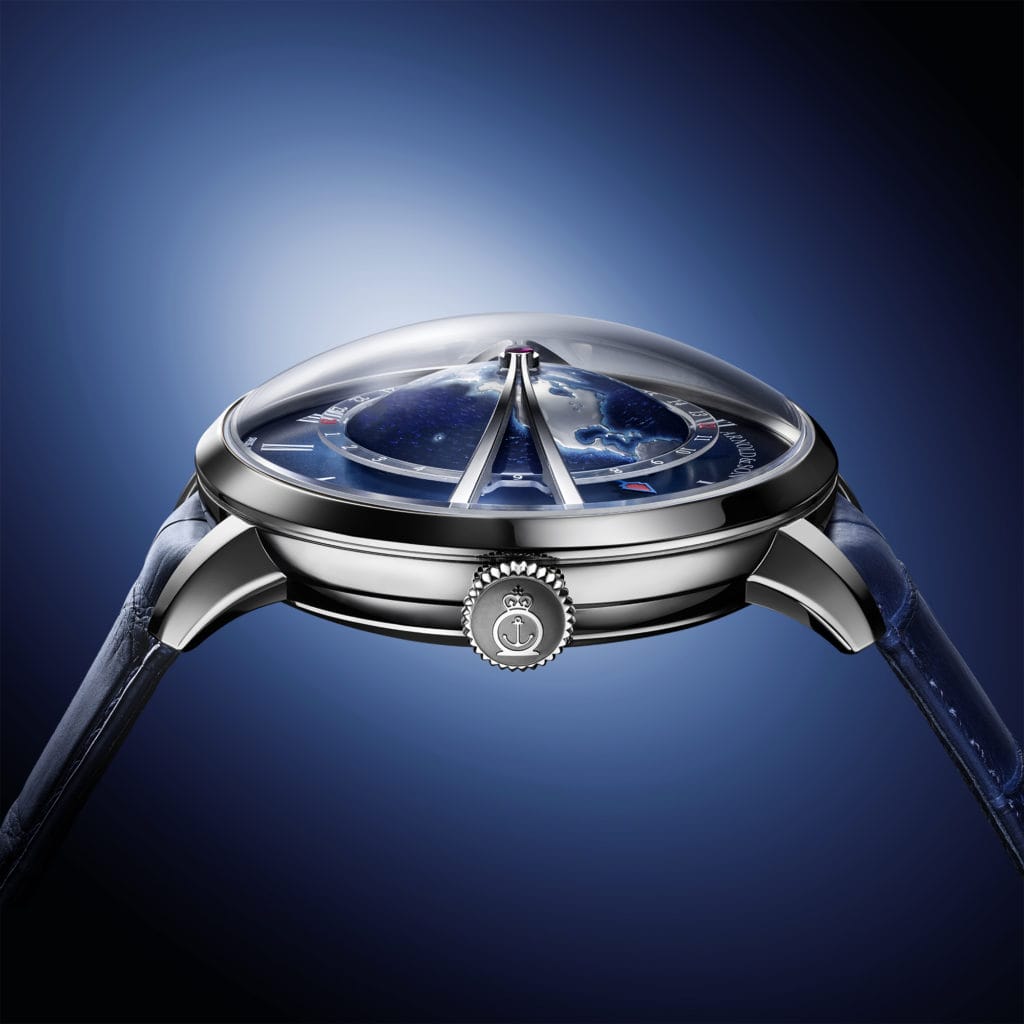 Arnold & Son a dessiné un boîtier aux lignes harmonieuses et souples. Il forme une ligne continue du bracelet au dôme de verre saphir qui surplombe le cadran. Ce dernier, grande coupole transparente, épouse le contour de l’arche en acier qui distingue la collection Globetrotter de tous les garde-temps. Cette arche est ajourée, satinée sur toutes ses surfaces planes, et ses chanfreins sont anglés et polis à la main. Ses lignes élancées s’appuient sur deux pieds vissés, comme un pont stylisé, jeté entre deux rives. Il enjambe ici la moitié du monde, la plus habitée et la plus dense en terres émergées : l’hémisphère nord.