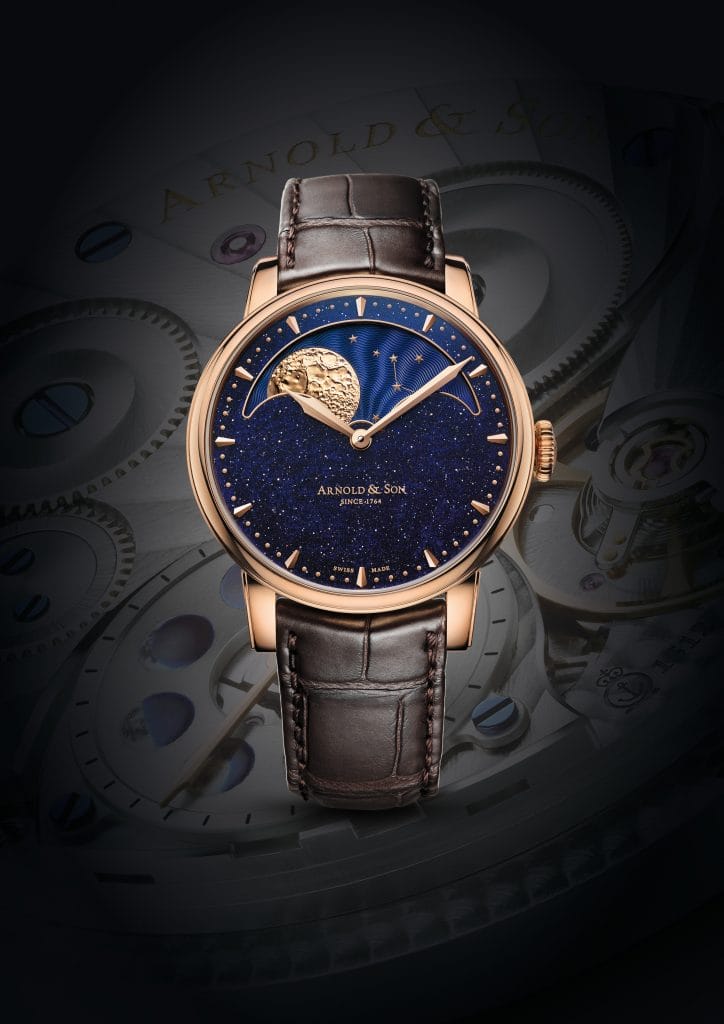 Mariant son histoire britannique à son savoir-faire horloger suisse, Arnold & Son présente la HM Perpetual Moon avec un cadran quartz aventurine bleu, préservant l’expertise en complications astronomiques de la Maison.