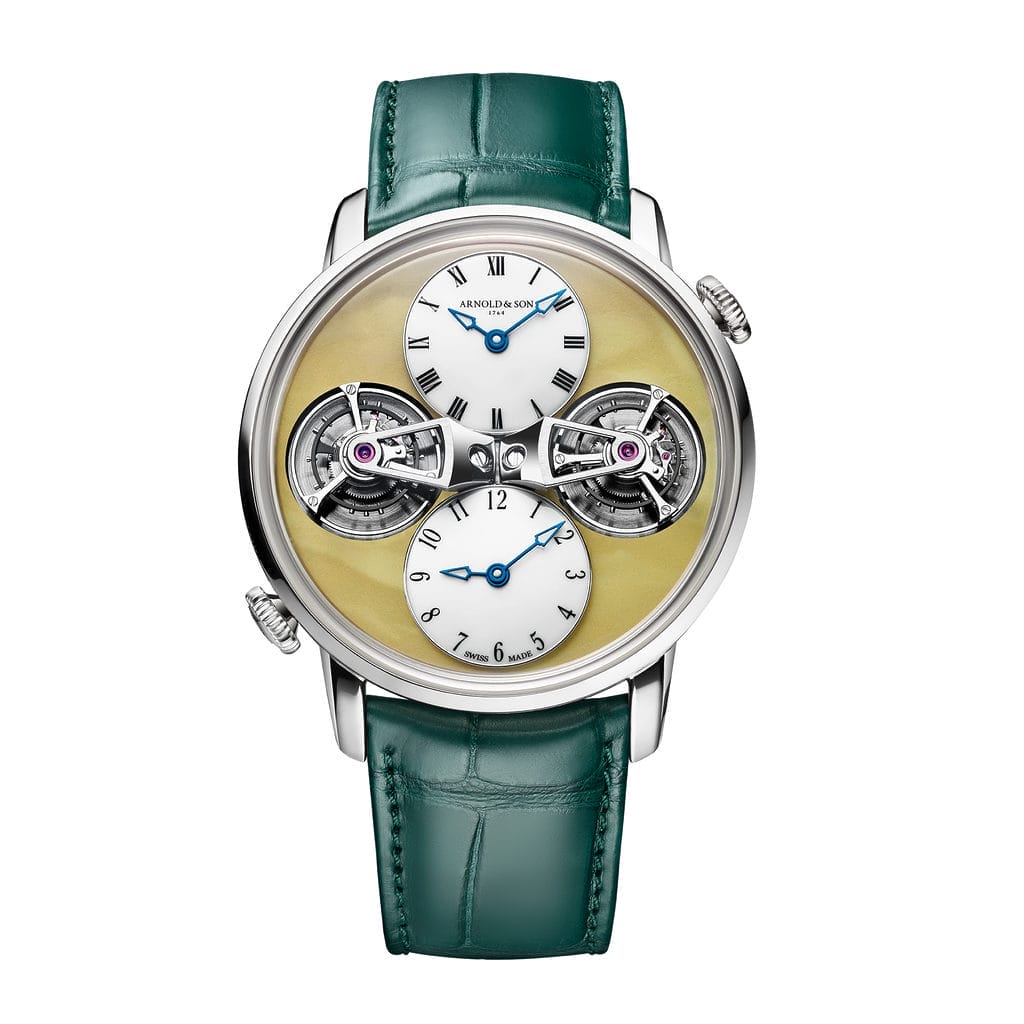 Dans le langage horloger d’Arnold & Son, le tourbillon est une construction rare, traitée avec le respect que ses 260 ans d’histoire ont enseigné à la marque. Construction encore plus exceptionnelle, le double tourbillon fait de la collection un véhicule de pièces uniques, comme c’est le cas pour ce modèle d’ambre.