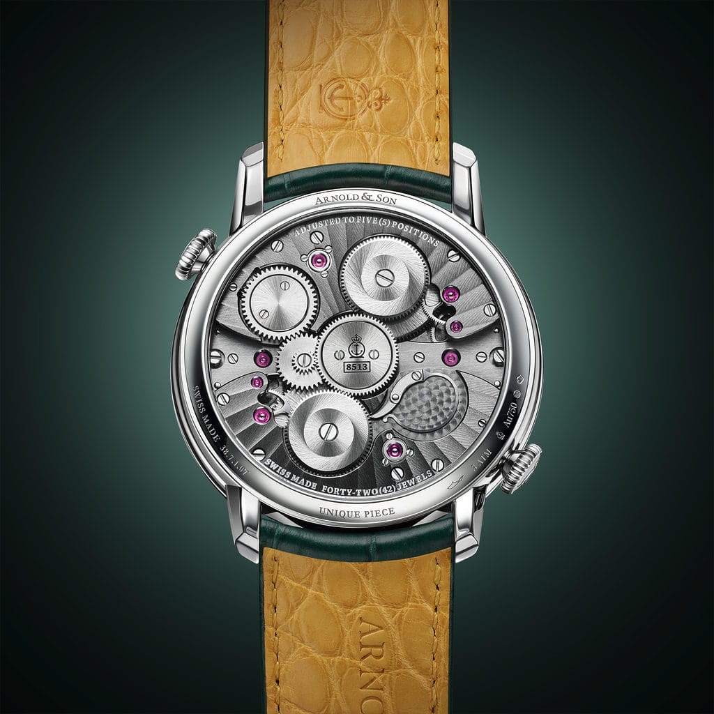 La structure de ce mouvement est soulignée par des finitions extrêmement abouties. Il s’agit là d’une spécialité de la manufacture Arnold & Son, portée au plus haut niveau sur ce modèle. Les Côtes de Genève rayonnantes, le perlage de la platine, le double colimaçonnage des barillets, le soleillage des roues de couronne, le polissage des chatons en or, tout dans le calibre A&S8513 respire l’élévation, la bienfacture, l’excellence.