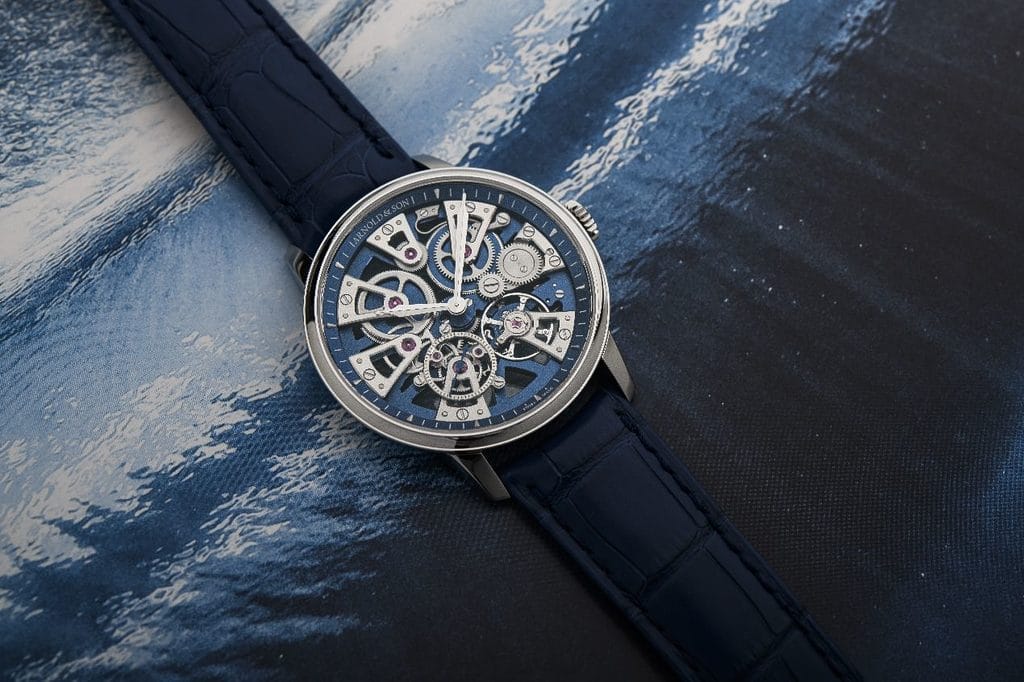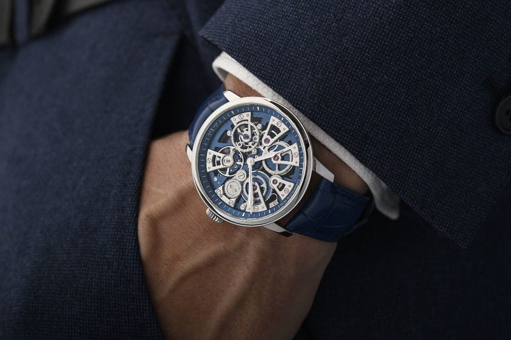 La version Blue Edition présente une unité chromatique dominée par le bleu du mouvement, obtenu grâce à un traitement PVD. Les finitions varient du satin horizontal côté cadran aux « Rayons de la Gloire » gravés côté fond. Les ponts, rochets, rouages et balancier sont traités au palladium, évoquant la teinte de l’acier du boîtier. Le bracelet, en alligator ou en caoutchouc, est également bleu, et une version avec bracelet acier à trois maillons est disponible.