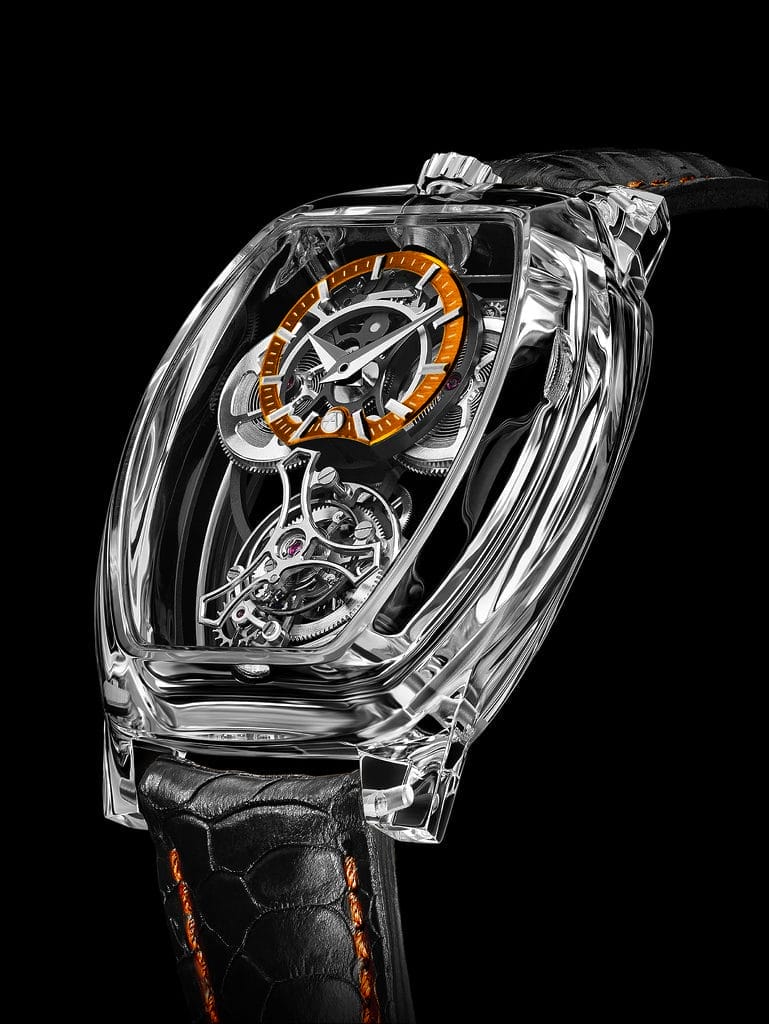 Trois montres, trois tourbillons, trois calibres manufacture de haute volée, et une expérience unique dans la maitrise du verre saphir. Les boitiers avec tous leurs attributs (couronne, lunette, cornes, flancs, fond) deviennent totalement transparents, laissant apparaitre la sublime architecture des mouvements. Les formes, les volumes, le dessin de chacune d’entre elles sont maniés avec élégance et raffinement.