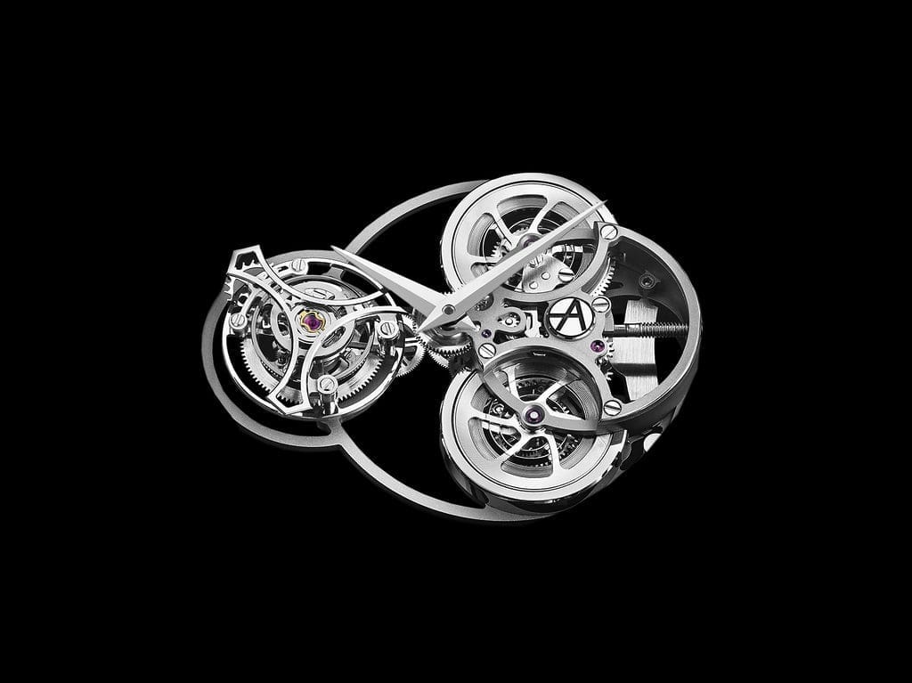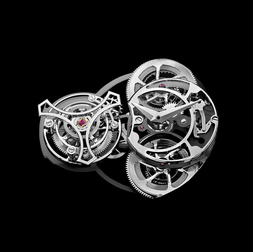 Chaque mouvement est squeletté à son maximum, offrant un poids total de seulement 9 grammes. Chacune de ces trois montres est ainsi une véritable œuvre d’art mécanique miniature, abritant un mouvement tourbillon à remontage manuel qui a été méticuleusement conçu et assemblé en étroite collaboration avec les maîtres horlogers de Telos.