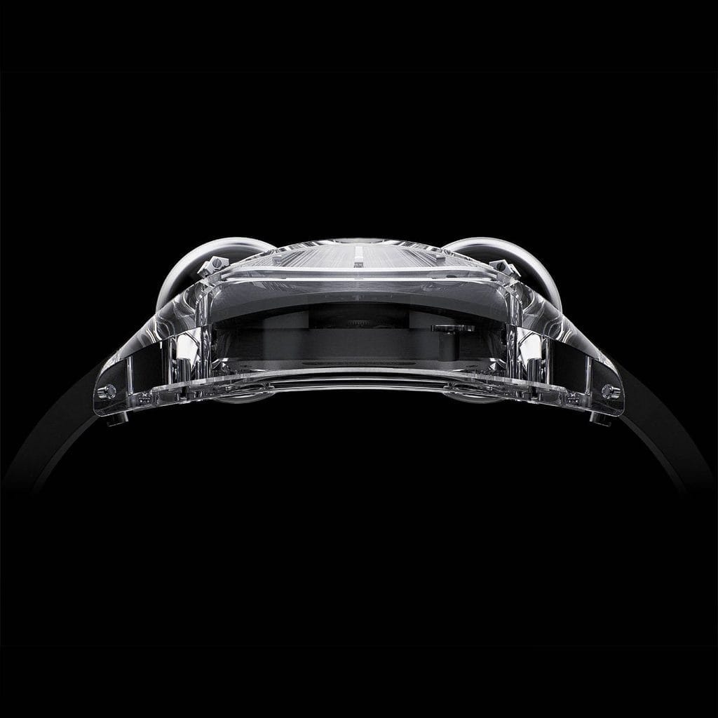 Le boîtier en saphir, signature d’ArtyA depuis plus de quinze ans, agit comme une vitrine totale sur le mouvement. Usiné pendant plus de 120 heures puis poli durant 140 heures, ce cristal synthétique atteint un niveau de transparence absolu.