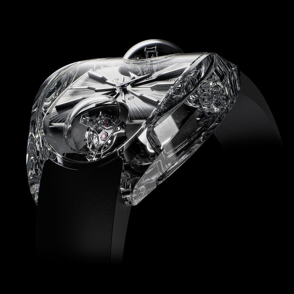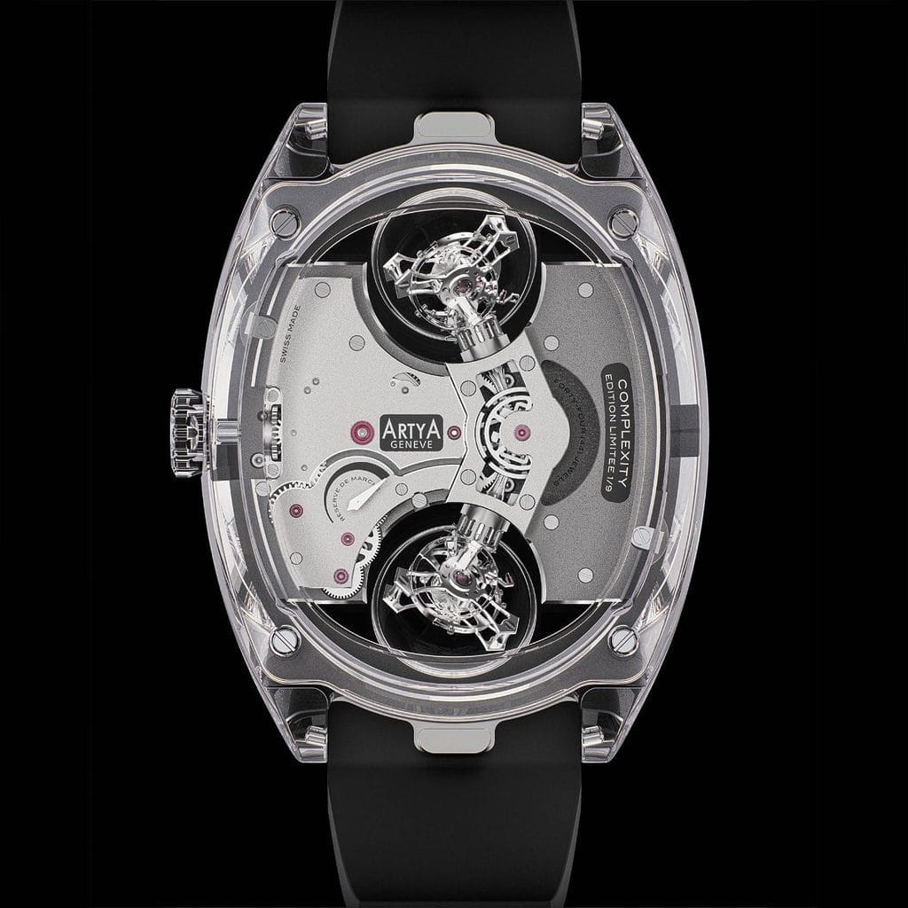 Avec la Complexity, ArtyA pousse ce principe à son paroxysme en associant deux tourbillons inclinés, positionnés à midi et 6 heures. Une configuration totalement inédite, où aucun des axes du balancier, de la cage et de l’ancre n’est parallèle.