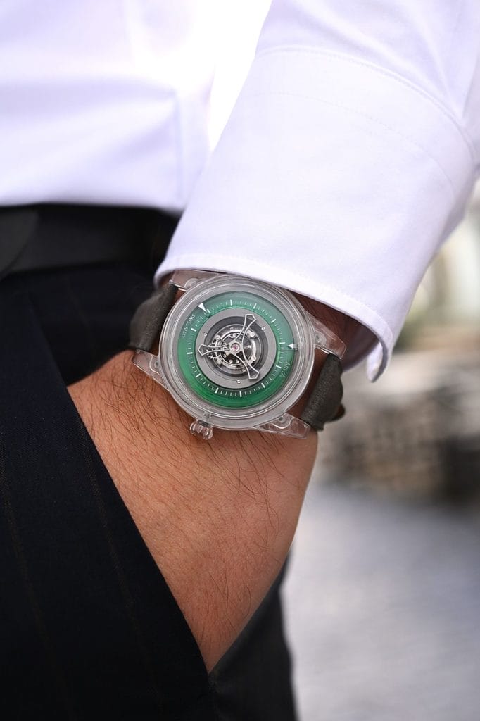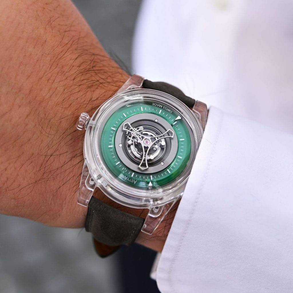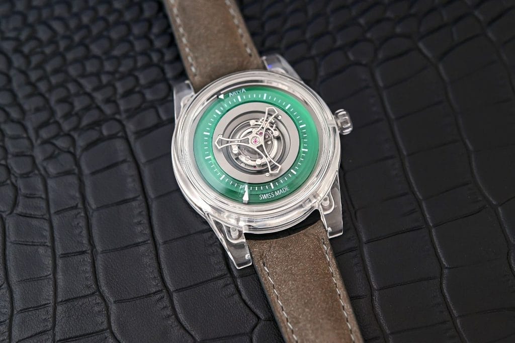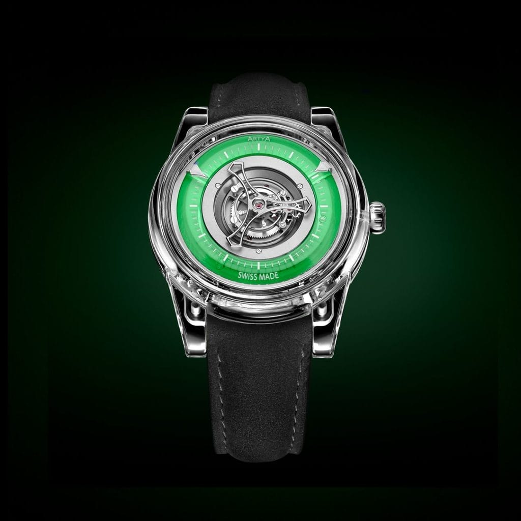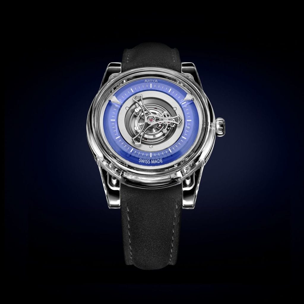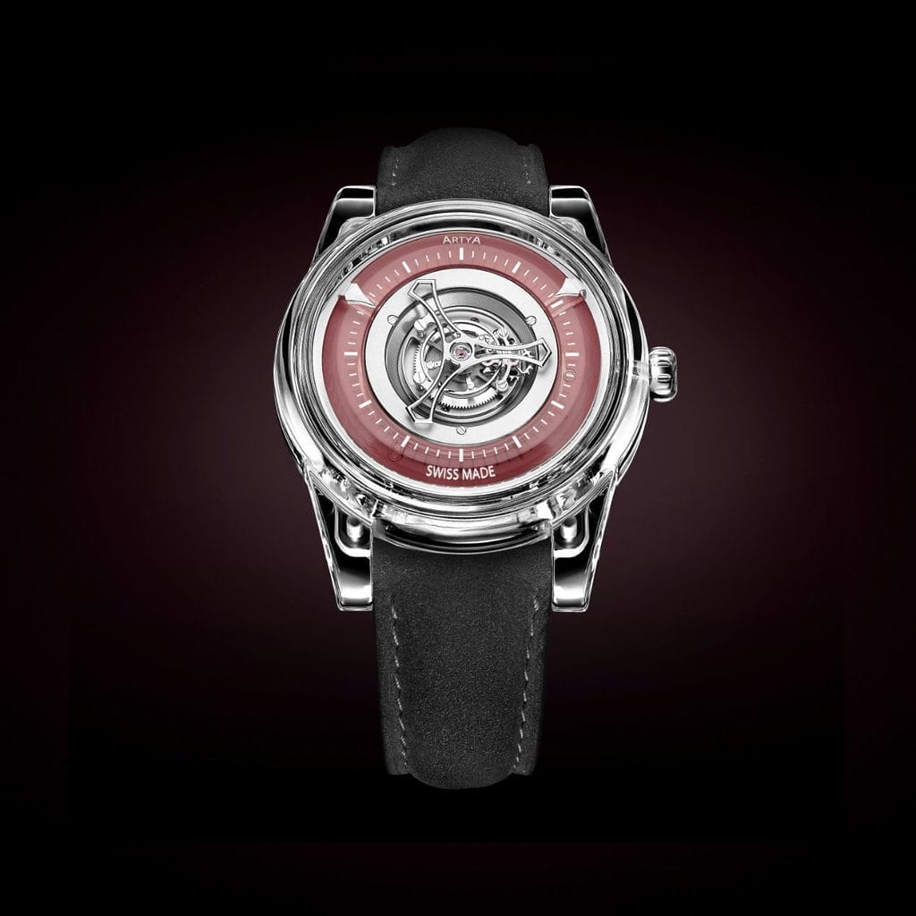 - L’esthétique traditionnelle du squelettage laisse place à une architecture audacieuse, mettant en valeur un mouvement tourbillon central automatique, une première dans l’histoire d’ArtyA.