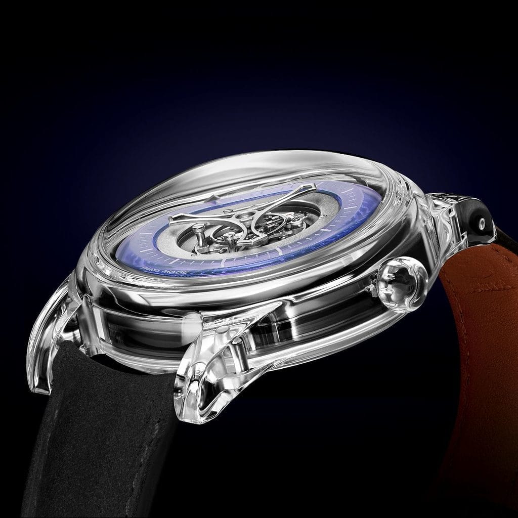- Conception audacieuse : Entièrement transparent, ce boîtier offre une vue panoramique à 360 degrés sur le mouvement.