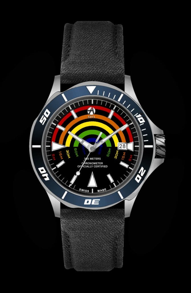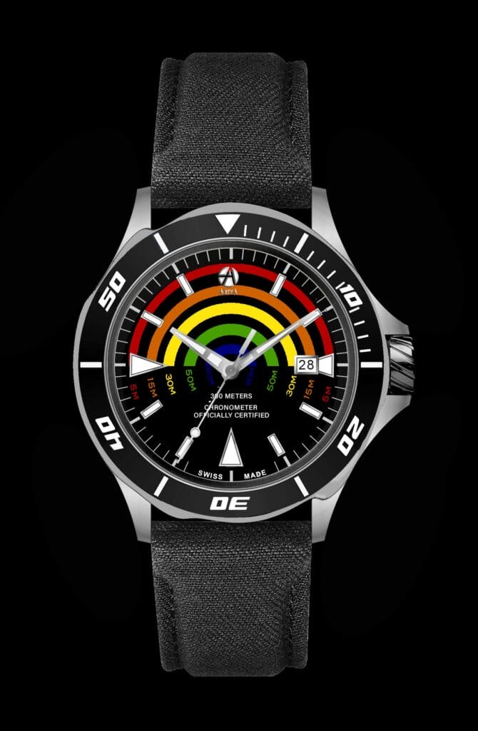 Pour compléter sa nouvelle collection de montres de plongée, ArtyA a décidé d’innover avec le premier cadran au monde permettant de mesurer la profondeur. Quoi de plus technique, artistique et poétique que de connaître sa profondeur avec un merveilleux spectacle de couleurs.
