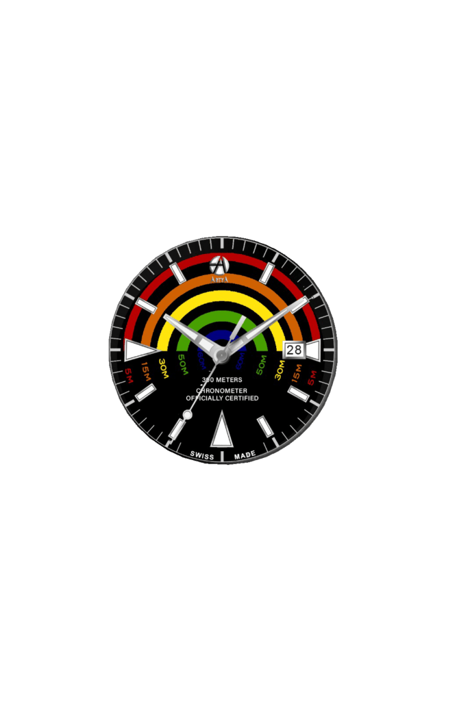 Mêlant utilité et esthétique, ce profondimètre a une forme totalement nouvelle. Ce cadran innovant reprend les principales couleurs qui disparaissent au fur et à mesure que vous plongez plus profondément. Du rouge au bleu, en passant par l’orange, le jaune et le vert, vous pouvez vérifier votre profondeur en regardant les couleurs encore visibles sur votre cadran. Disponible avec une lunette bleue ou noire.