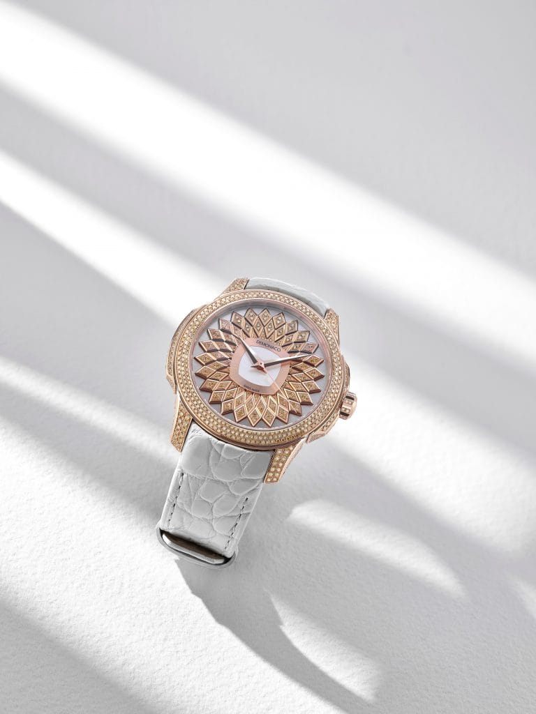 Ce mouvement traditionnel est habillé d’une boîte en or rose 18 carats sublimée par 617 diamants de couleur champagne, sertis de manière à épouser parfaitement la forme de la boîte. En totale adéquation avec cette dernière, une délicate fleur appelée King Protéa est représentée sur le cadran. Trois rangées de 24 chatons de forme losange accueillent 120 diamants champagne pour composer la corolle. Le cœur de la fleur est en nacre blanche, et est entouré d’une bague en or rose. Enfin, pour rappeler la couleur de la nacre blanche et de la base du cadran en or rose rhodié, un bracelet en alligator blanc permet de magnifier le tout.