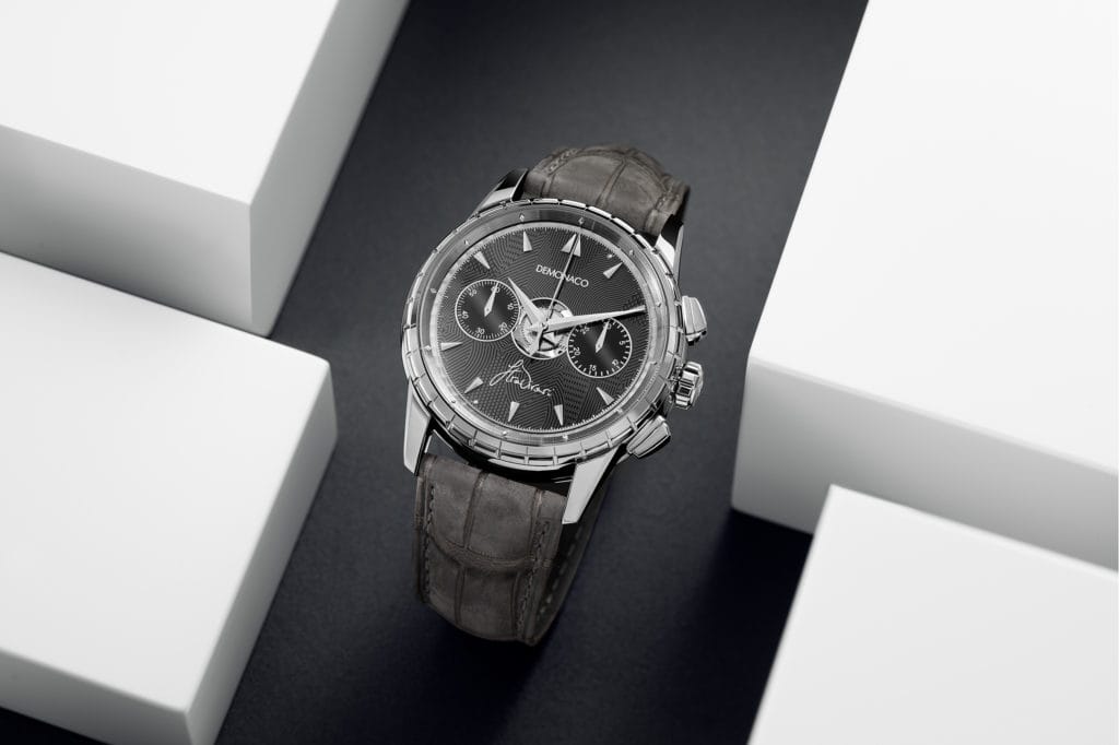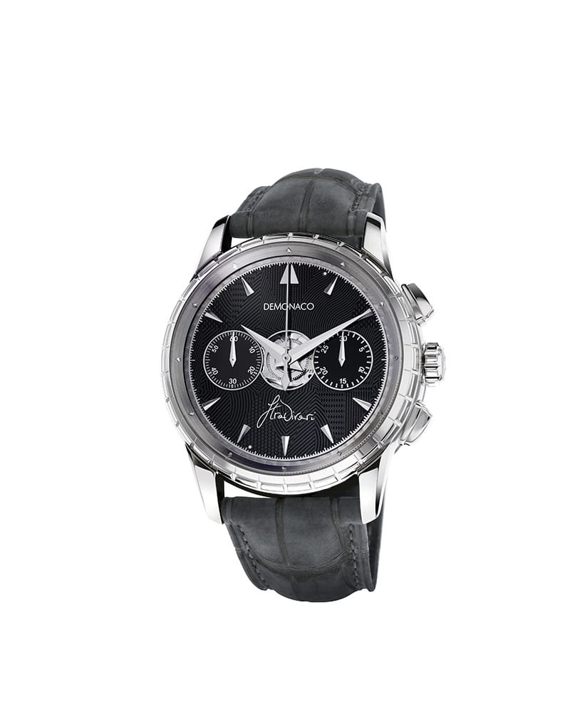 Enveloppé dans un boîtier de 42 mm sublimé par une carrure en relief, son cadran noir à la géométrie bien étudiée, dont les lignes se mêlent et s’entremêlent pour emporter celui qui l’admirera vers d’autres horizons, révèle l’esprit onirique de Luca Stradivari. De vifs index triangulaires polis, appliqués et courbés, dont les directions s’opposent, encadrent ce voyage et confèrent à la pièce un dynamisme certain. D’élégantes aiguilles dauphines indiquant les heures, les minutes et les secondes du chronographe, survolent la signature de l’architecte & designer, qui se loge fièrement à 6 heures. A 9 heures, on retrouve le compteur des petites secondes, et à l’extrême opposé, celui des minutes du chronographe.