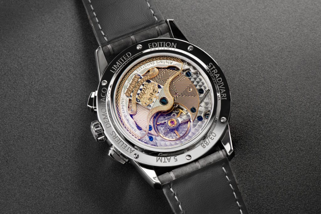 Fidèle à sa passion pour la Haute Horlogerie, Ateliers deMonaco a conféré à sa dernière création un fond ouvert permettant d’admirer le calibre dMc-760. Satinage circulaire, perlage, Côtes de Genève, anglage et traits tirés subliment alors les ponts de ce dernier, décorations méticuleusement réalisées à la main. Pour parfaire l’unité, une masse oscillante en or 22 carats, signature de toutes les montres automatiques de la Maison, s’articule délicatement autour du mouvement. Cadencé à 28’800 battements par heure, le mouvement offre une réserve de marche de 38 heures.