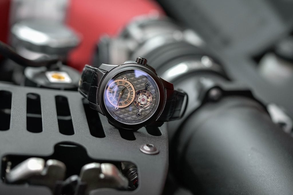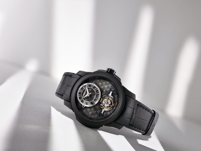 Enfin, pour magnifier le tout, la montre est montée sur un bracelet noir en cuir d’alligator avec coutures cousues à la main et une boucle déployante en titane noir DLC pour plus de praticité.