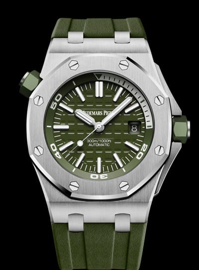 Le cadran vert kaki orné du motif « Méga Tapisserie » est assorti au bracelet en caoutchouc de la même couleur pour arborer un look dans l’air du temps. Étanche jusqu’à 300 mètres.