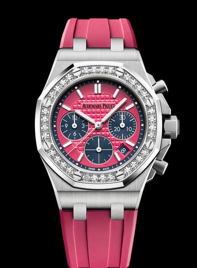 Le cadran rose vif orné du motif « Lady Tapisserie » est entouré de 32 diamants taille brillant sur la lunette, créant un contraste marqué.