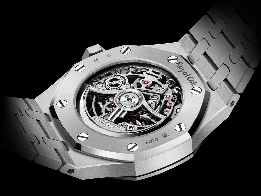Durant les premières années de la collection Royal Oak, les calibres demeurent cachés à l’intérieur des boîtes. C’est l’arrivée du quartz qui permet de redéfinir les codes horlogers, poussant l’industrie à mettre en valeur la beauté des mouvements mécaniques et des savoir-faire traditionnels nécessaires à leur création. C’est sous forme de pendentif (Modèle 5710BA) que le squelettage fait son apparition dans la collection Royal Oak en 1981, suivi en 1986 par le modèle 25636 équipé du mouvement ultra-plat à calendrier perpétuel, Calibre 2120/2800. Cependant, c’est au cours des années 1990, une décennie marquée par un foisonnement de modèles Royal Oak de toutes tailles et de tous styles, que cet art raffiné s’établit véritablement dans la collection, intégrant notamment la ligne « Jumbo » en 1992.