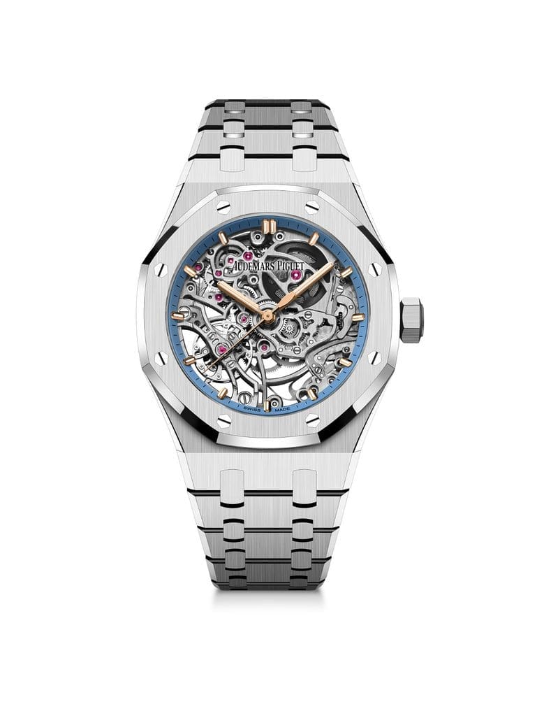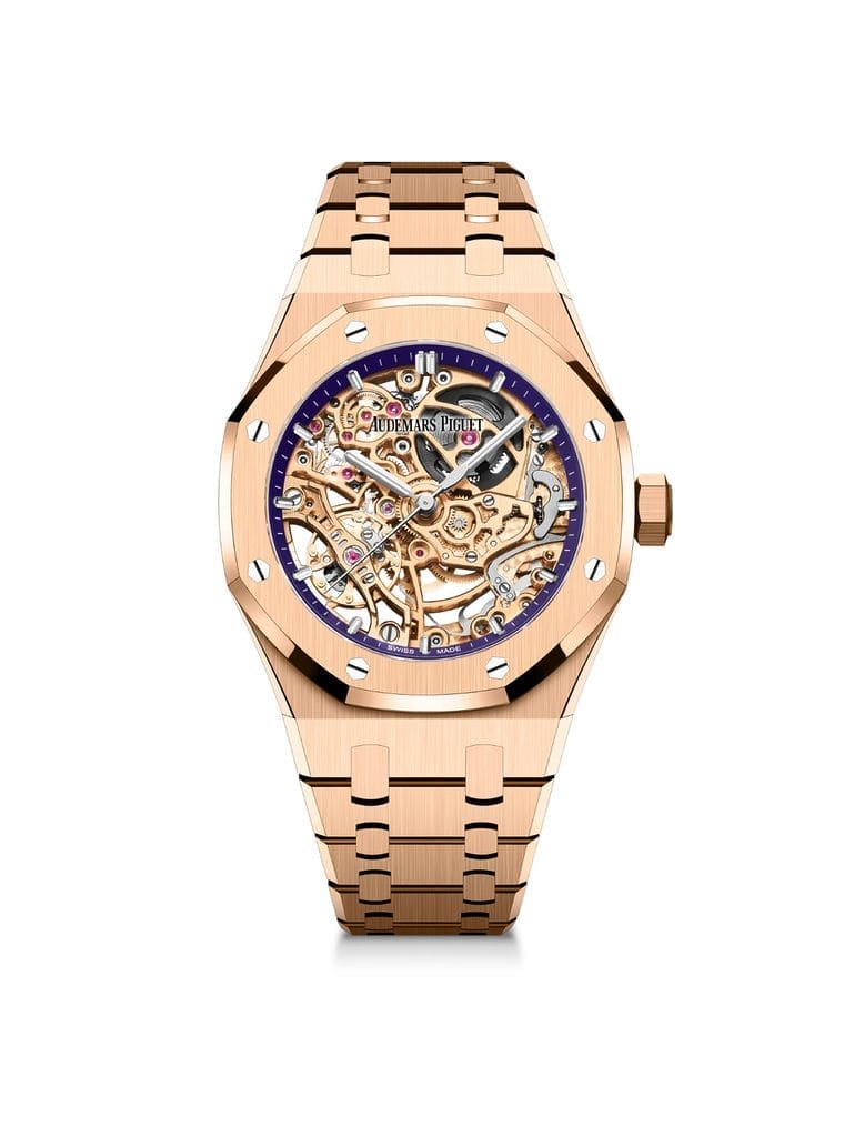 Le coloris de l’or trouve un écho dans les finitions tantôt rhodiée, tantôt dorées roses du mouvement pour une esthétique ton-sur-ton toute en élégance. La version en or gris 18 carats arbore des aiguilles et des index facettés et luminescents en or rose se détachant sur le mouvement aux tons rhodiés. Ce dernier est encerclé par un réhaut bleu clair qui attire l’œil sur la myriade de détails à l’œuvre au cœur de la montre. Le modèle en or rose est pour sa part doté d’index et aiguilles en or gris recouverts d’un dépôt luminescent. Le mouvement squeletté au ton doré rose est contrasté par un réhaut de couleur violette qui confère éclat et modernité à la pièce. Le cadran des deux garde-temps est complété par la signature « Audemars Piguet » imprimée en noir sur le dessous de la glace saphir.