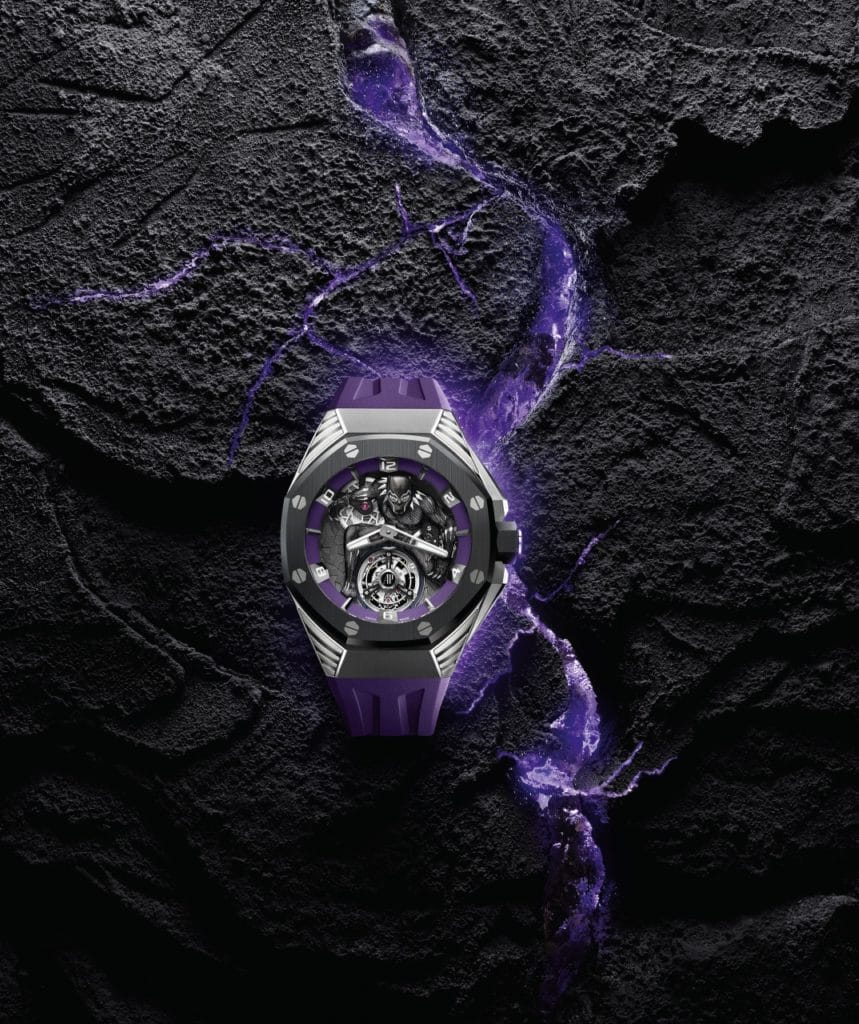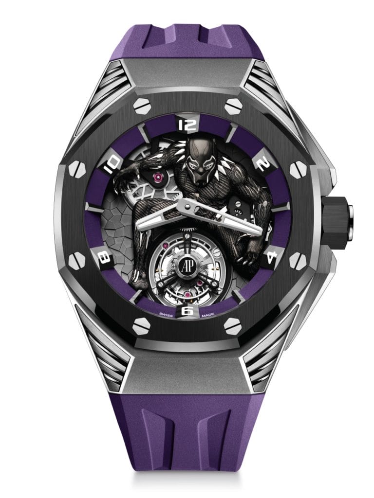 Personnage Black Panther 3D en or gris peint à la main, réhaut violet, index en or gris avec dépôt PVD noir, aiguilles Royal Oak en or gris avec dépôt luminescent.