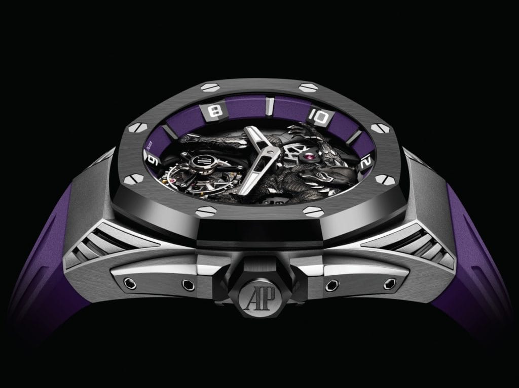 Profondément ancrée dans la tradition, la boîte ultrarésistante présente des finitions main raffinées. La lunette en céramique noire alterne surfaces satinées et surfaces polies, marque de fabrique d’Audemars Piguet. La boîte en titane combine pour sa part une esthétique texturée avec des surfaces microbillées jouxtant des inserts en titane poli. Les vis hexagonales en acier satiné fixent la lunette sur la boîte et renforcent le look bicolore de la montre alors que le joint violet apparent ajoute une touche intense de couleur.