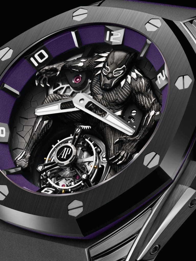 Pour lancer cette nouvelle série, Audemars Piguet a créé une montre Black Panther en hommage aux valeurs familiales et à l’alliance harmonieuse de tradition et de technologie personnifiées par le héros. Conjuguant savoir-faire ancestral et technologie futuriste, la Royal Oak Concept «Black Panther » Tourbillon Volant met en lumière la créativité inépuisable de la Manufacture en termes de montres compliquées. Ce modèle de 42 mm incarne également la volonté de la marque d’établir des connexions avec des univers culturels très différents, cherchant l’inspiration au-delà du monde de la Haute Horlogerie et puisant notamment dans la culture pop, l’art et l’industrie du divertissement.