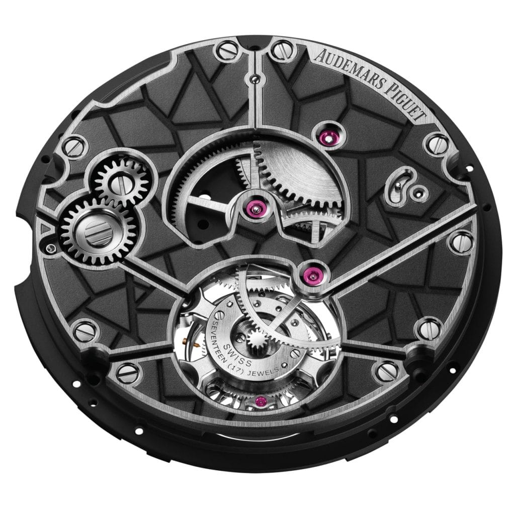 Pionnière à bien des égards, cette montre est dotée du Calibre 2965, dernière évolution du mécanisme à remontage manuel équipé d’un tourbillon volant et lancé à l’origine par Audemars Piguet en 2018 dans la collection Royal Oak Concept. Le design bicolore de la cage du tourbillon apporte une touche contemporaine qui s’intègre à l’esthétique de la montre et met en valeur le mouvement grâce à un effet 3D.