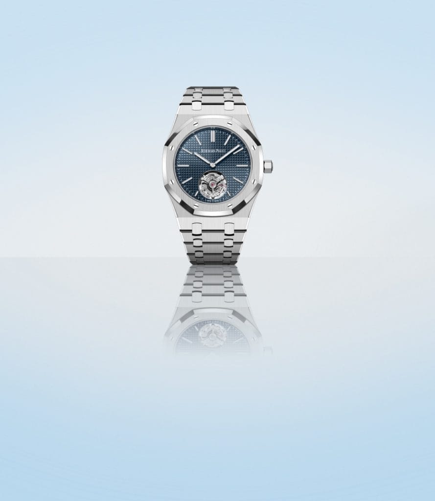 Cadran Bleu Nuit, Nuage 50 avec motif Petite Tapisserie, aiguilles Royal Oak et index en or gris avec dépôt luminescent.