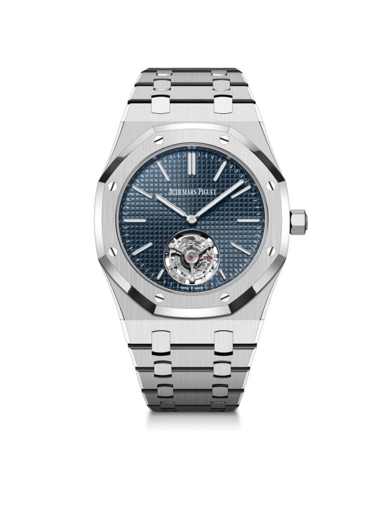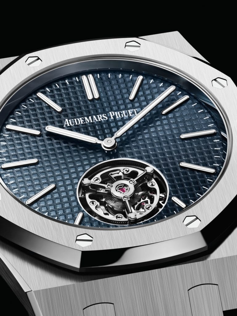 Tout comme pour le modèle de 1972, cette nouvelle référence « Jumbo » arbore des index et aiguilles de forme baignoire avec revêtement luminescent pour une lisibilité optimale dans l’obscurité. La signature Audemars Piguet, tout comme l’échelle des minutes, est imprimée en blanc sur la tapisserie. Opérant ses rotations à 6h, la cage du tourbillon volant en titane se détache de la toile bleue de la tapisserie pour créer un contraste aérien à l’effet hypnotisant.