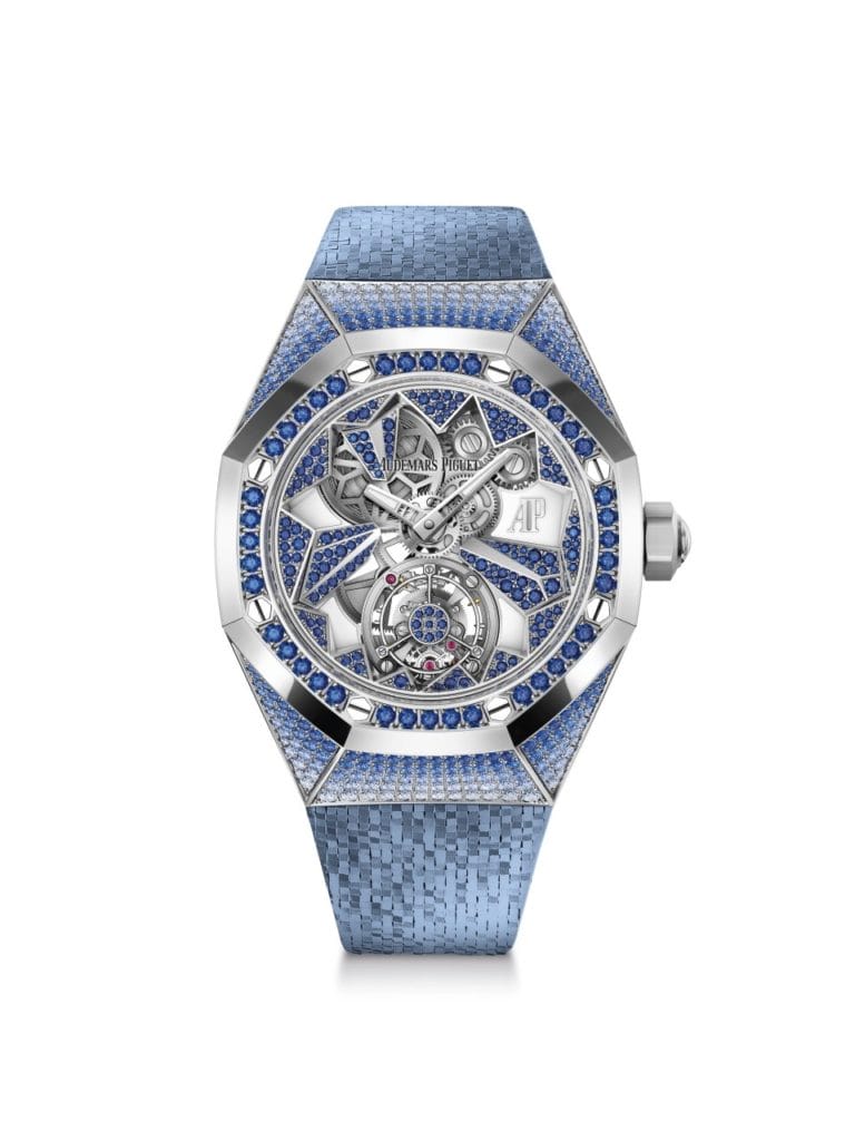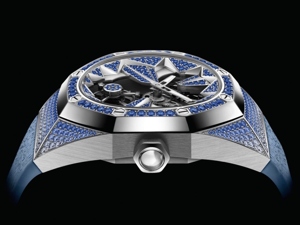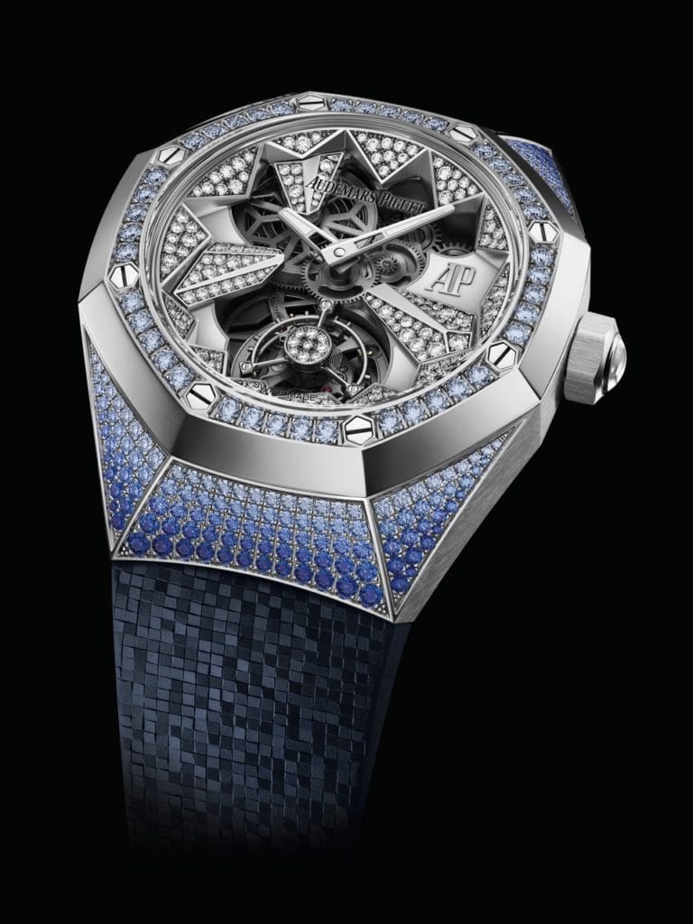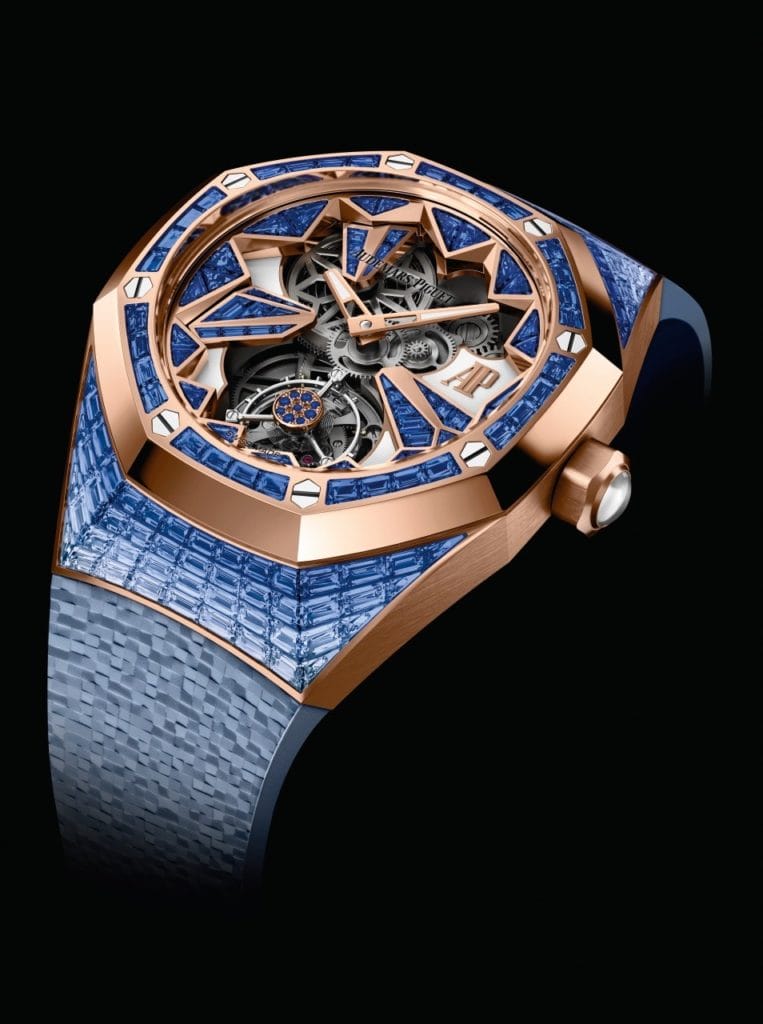 La nouvelle série inclue deux Royal Oak Concept Tourbillon Volant en or gris ou rose 18 carats recouvertes de 208 saphirs bleus taille baguette qui procurent un dégradé de couleurs. Les pierres ont été taillées dans 144 formats différents afin d’épouser les courbes de la boîte et l’architecture du cadran et des composants du mouvement. De minuscules rainures ont été délicatement taillées dans chaque pierre afin de permettre leur insertion sur un rail invisible, installé sur le composant en or, donnant ainsi l’impression que les pierres tiennent par elles-mêmes. Le sertissage invisible pour chacune des deux pièces représente 150 heures de travail.