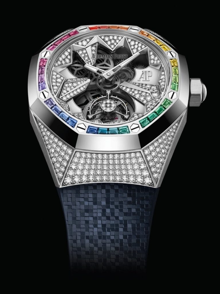 Les deux versions rainbow arborent 12 variétés différentes de pierres parmi lesquelles le rubis, la tsavorite, l’émeraude, la topaze, la tanzanite, l’améthyste et des saphirs colorés. Chaque pierre a été choisie avec soin pour offrir des nuances vives et une gradation harmonieuse une fois combinée aux autres. Les tons progressifs rouges, orange, jaunes, verts, bleus et violets soulignent la géométrie octogonale de la boîte et de la lunette, tout en réfléchissant la lumière pour créer un effet d’optique similaire à celui d’un arc-en-ciel. Si le premier modèle combine une boîte et un cadran sertis de diamants à une lunette rainbow taille baguette, l’autre a été entièrement serti de pierres de couleur taille brillant.