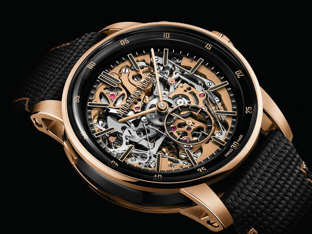 Les garde-temps sont complétés par un bracelet caoutchouté noir orné d’une couture assortie au ton de l’or, doublé de cuir de veau et terminé par une boucle déployante AP.