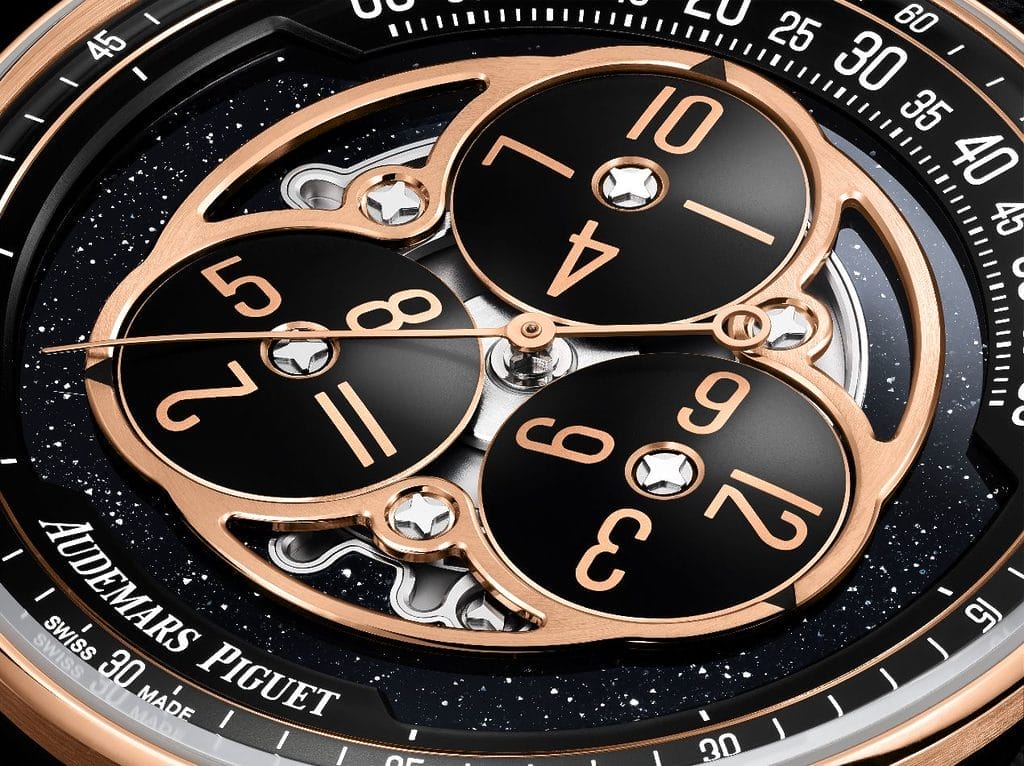 Le design de cette nouvelle édition exprime une modernité affirmée. La boîte de 41 mm associe une lunette et un fond en or rose 18 carats à une carrure en céramique noire, créant un contraste de matières et de teintes qui souligne la géométrie architecturale propre à la collection Code 11.59 by Audemars Piguet. Le cadran en aventurine noire, ponctué de disques en opaline noire et de chiffres dorés, offre une profondeur visuelle captivante, enrichie par les reflets du rotor central.