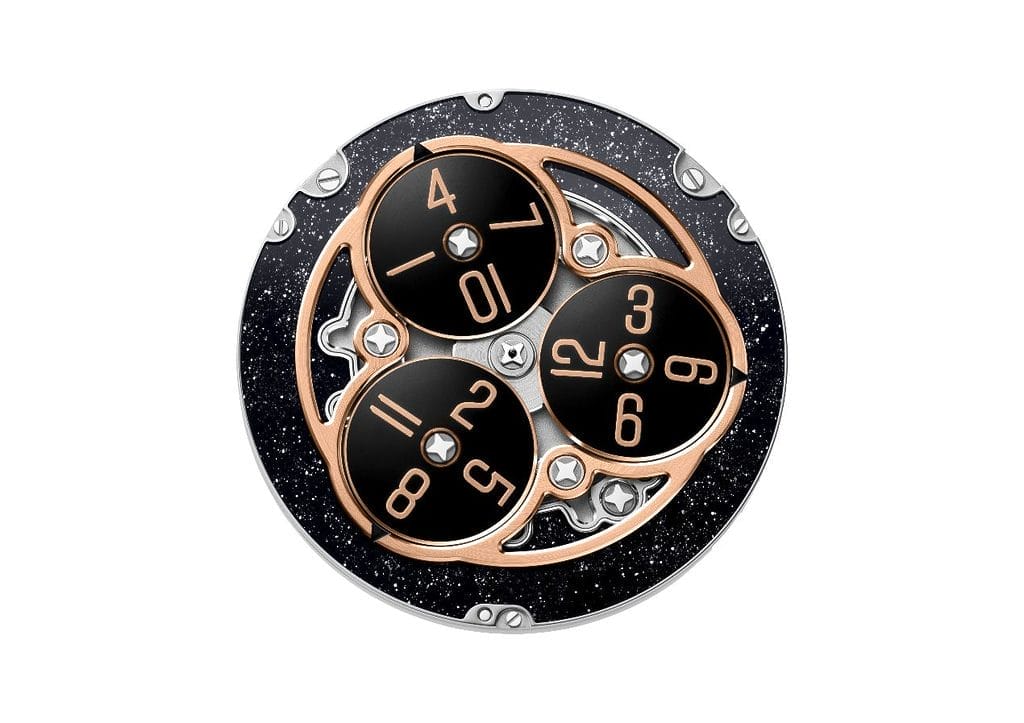 L’affichage repose sur un rotor central effectuant une rotation complète toutes les trois heures. Trois disques en aluminium, chacun portant quatre chiffres de 1 à 12, y sont fixés. Ils tournent sur leur propre axe et désignent tour à tour les minutes sur un secteur de 120 degrés situé dans la partie supérieure du cadran. Une aiguille des secondes en or rose 18 carats, légèrement courbée à son extrémité pour épouser le relief des disques, ajoute dynamisme et fluidité à la lecture du temps. Le résultat est une mise en scène horlogère poétique et contemporaine, où le mouvement semble suspendre le temps.