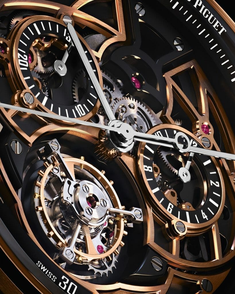 Faisant écho à la boîte bicolore, le mouvement architecturé juxtapose des ponts ajourés dans les tons noirs et rosés, répondant au balancier doré rose. Les aiguilles en or gris 18 carats apportent de la lumière au cœur du mouvement. Les ponts et les éléments décoratifs, qui comptent 111 angles rentrants, ont été sablés, satinés et polis à la main. À elles seules, les décorations représentent plus de 70h de travail, soulignant ainsi le savoir-faire technique et extrêmement précis des artisans d’Audemars Piguet. De ces gestes méticuleux résulte une alternance de finitions brillantes et mates qui crée un captivant jeu de lumière donnant de la profondeur aux différents niveaux du mouvement.